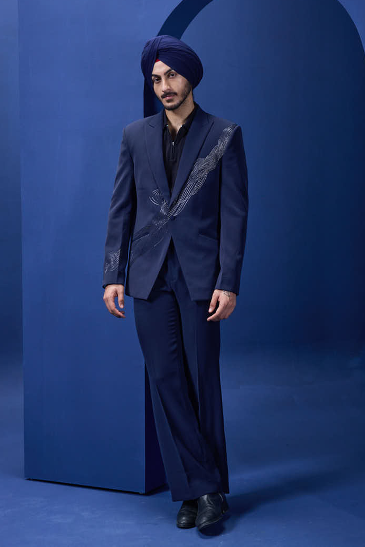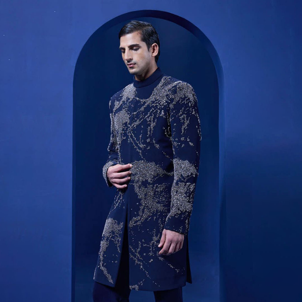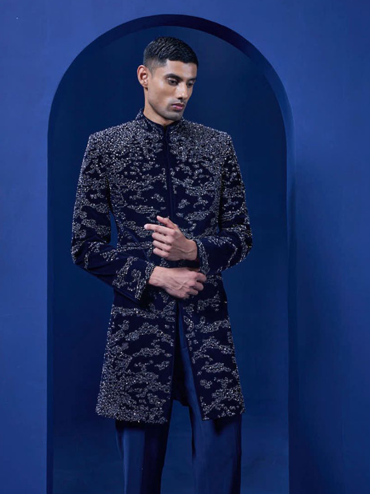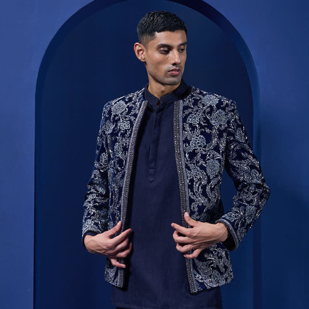 Navy blue tuxedo highlighted with pearls sequins cutdana and thread work