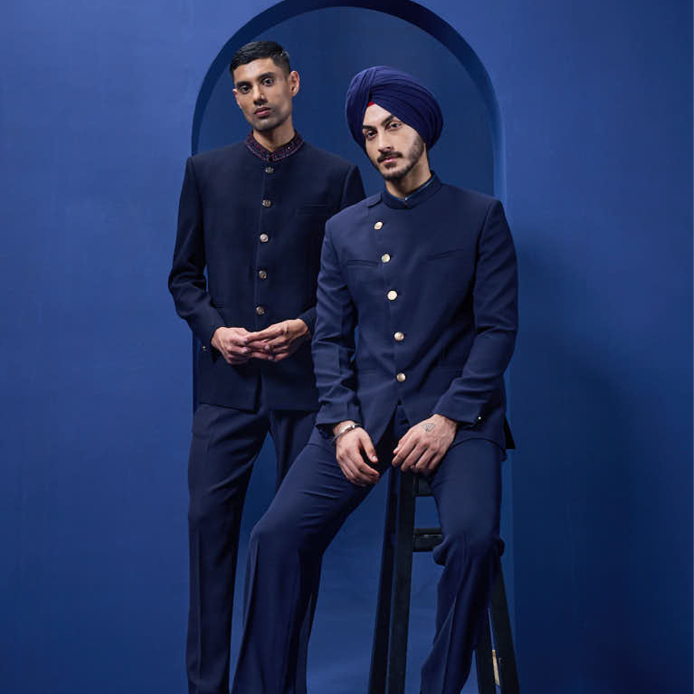 Navy blue bandhgala detailing with golden button
