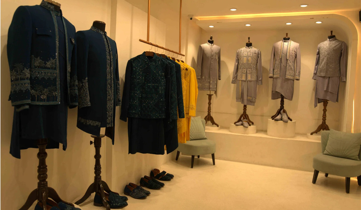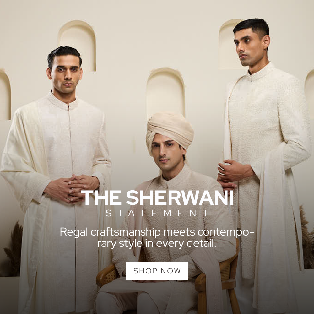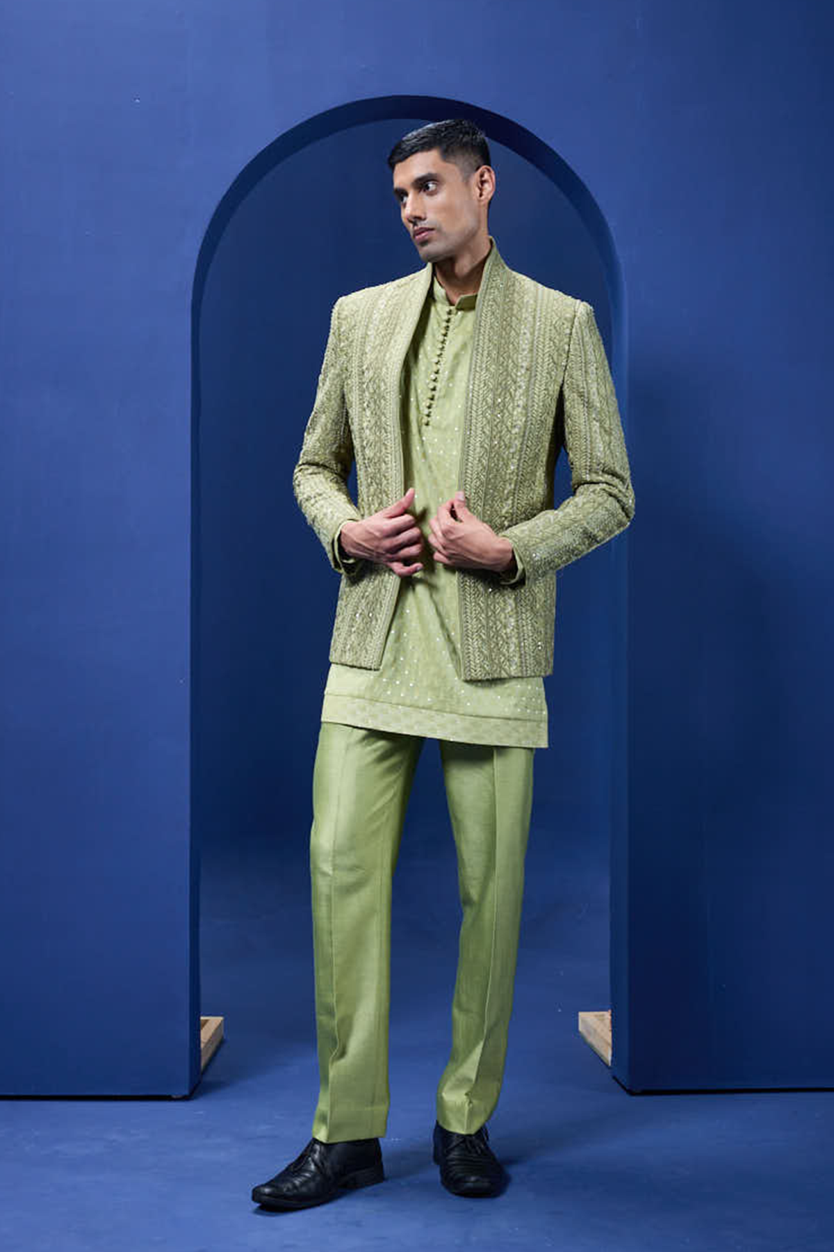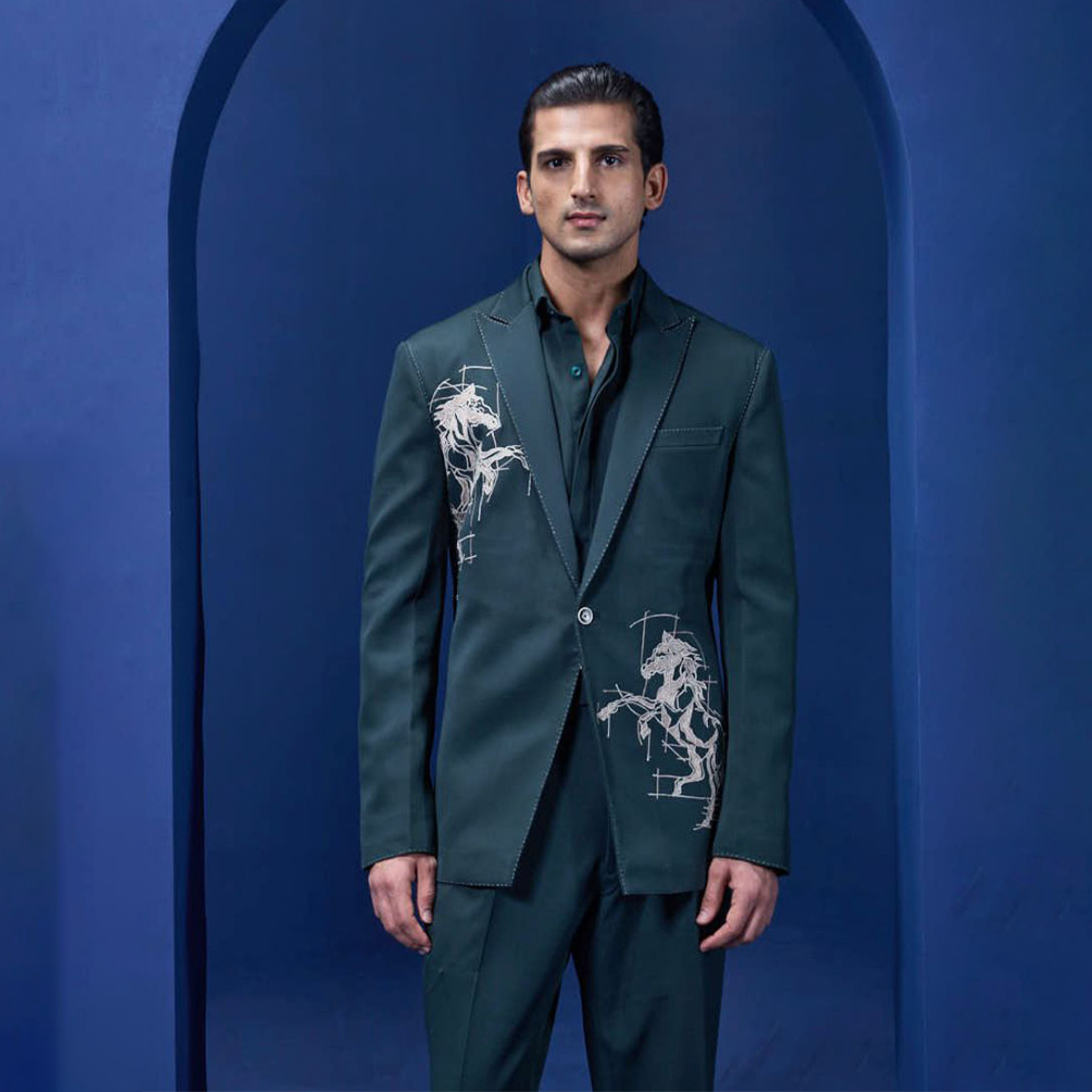 Teal blue tuxedo highlighted with sequins pearls and cutdana