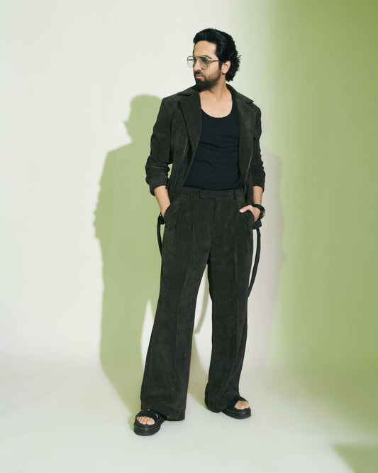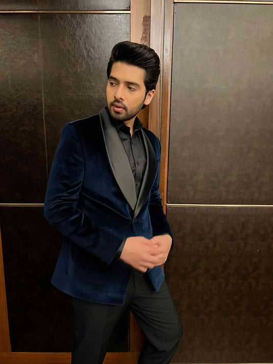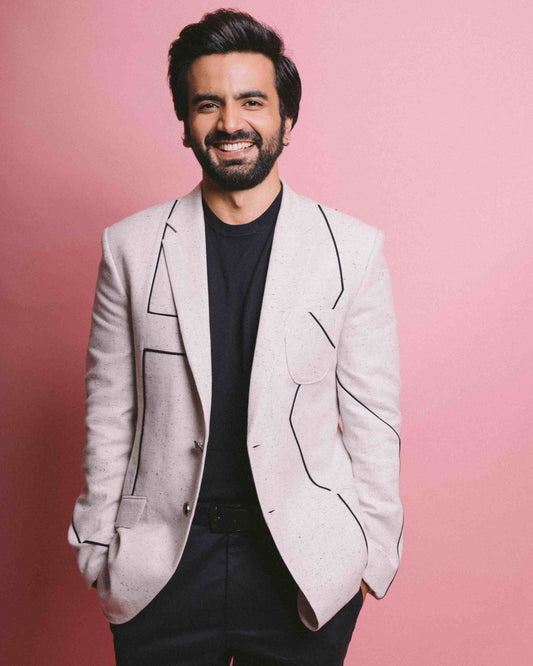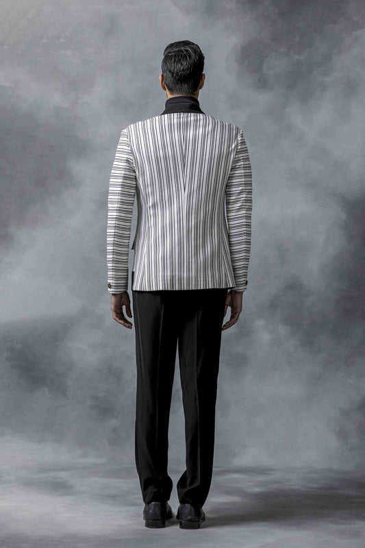 Amaal mallik in black broken stripe tuxedo with pearl highlights