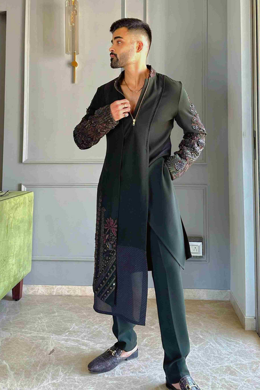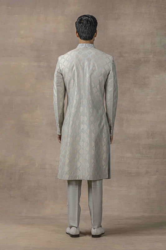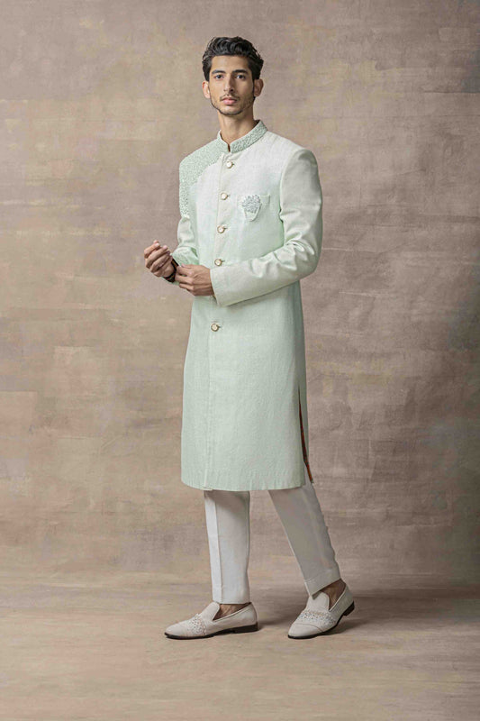 Aqua dhagai sherwani highlighted with 3d thread work and pearl
