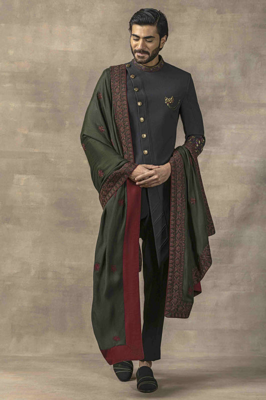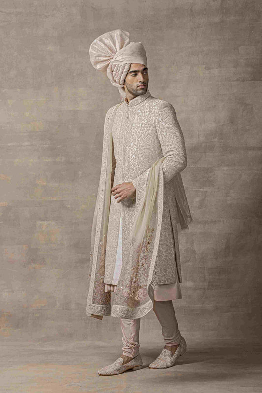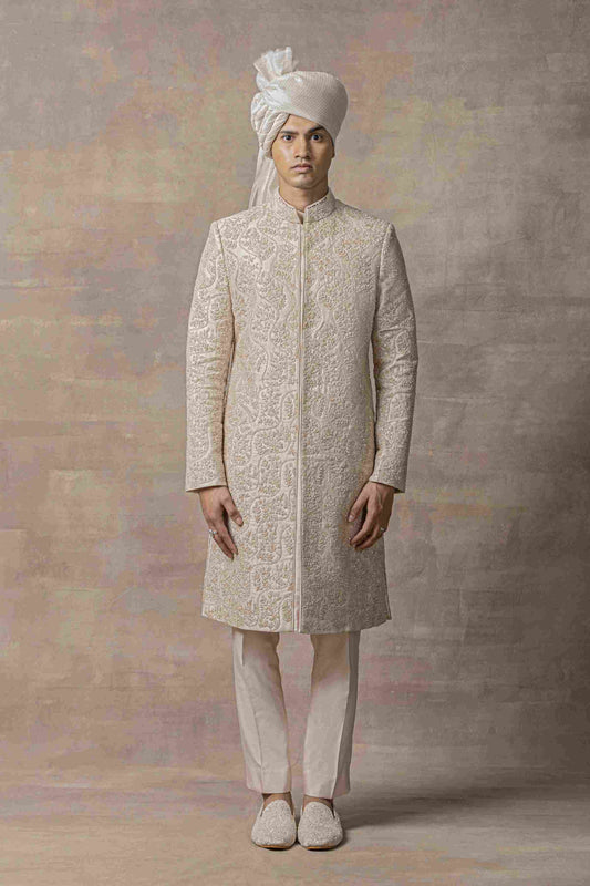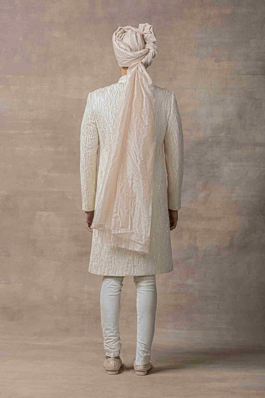 Off white sherwani highlighted with thread pearl and multi coloured sequin