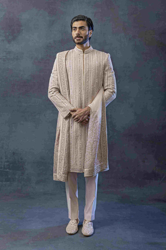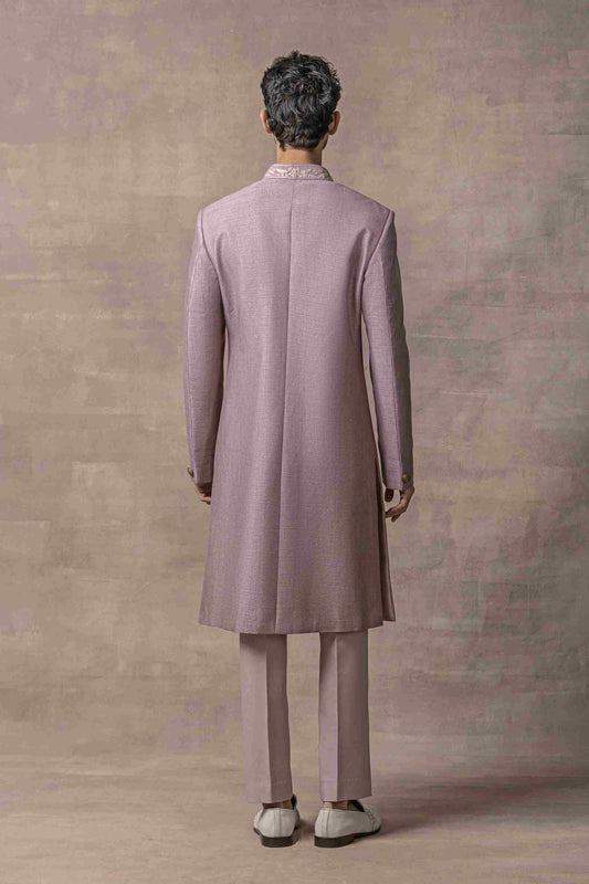 Dusty rose sherwani with thread work highlighted with pearl and sequin
