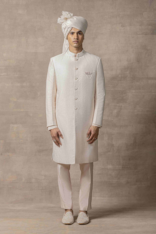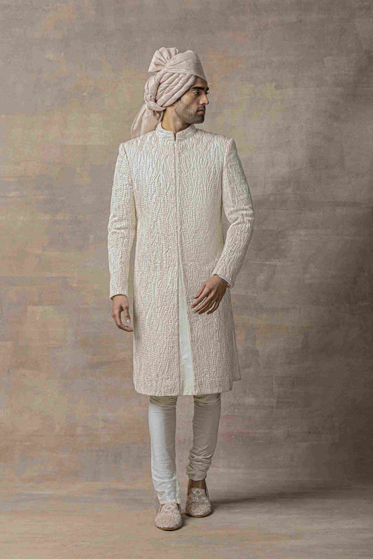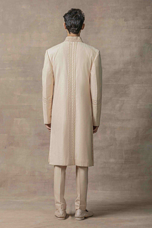 Off white dhagai sherwani with placement dori work highlighted with pearl and sequin