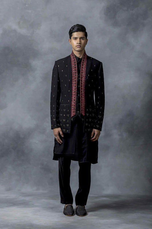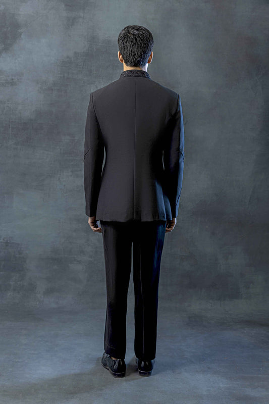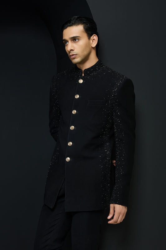 Black bandhgala highlighted with pearls and sequins