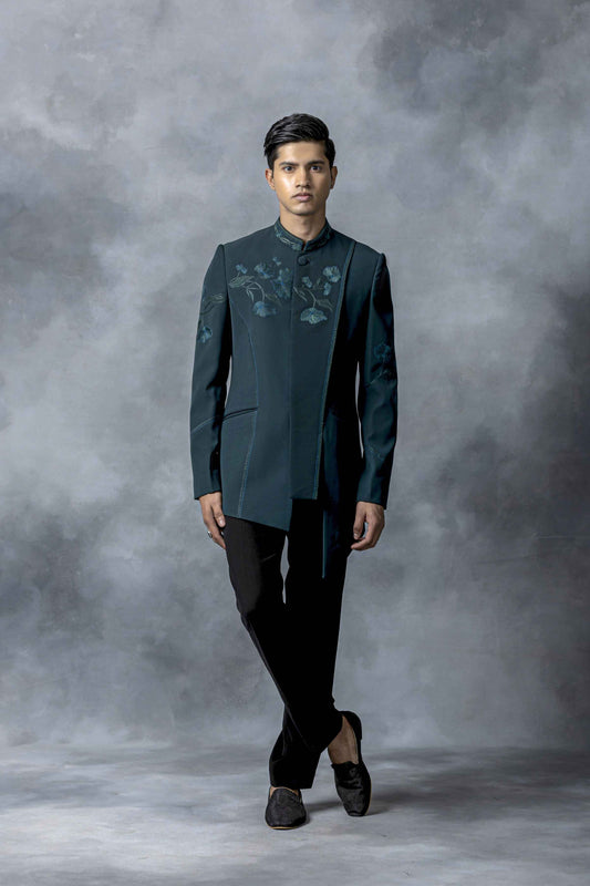 Teal bandhgala with black scalping set