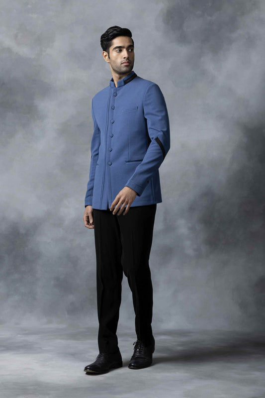 Blue bandhgala with black leather detailing