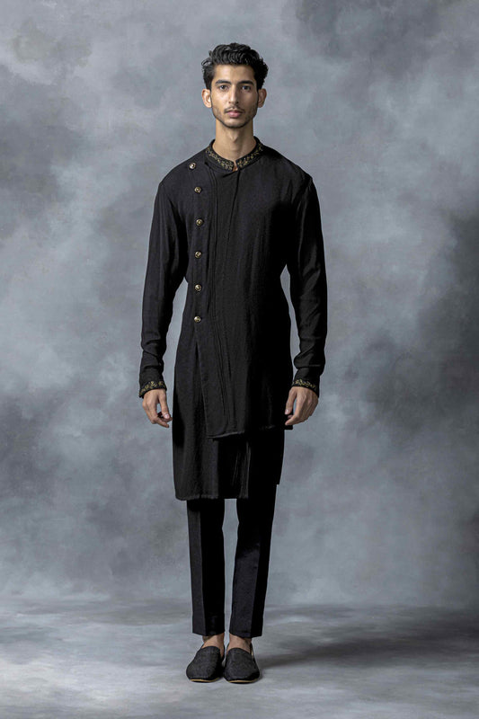 Black bandhgala with slant cut detailing with golden button and with satin taping