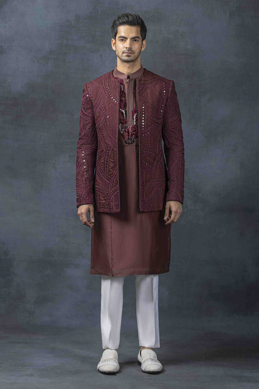 Wine mirror work open bandhgala set