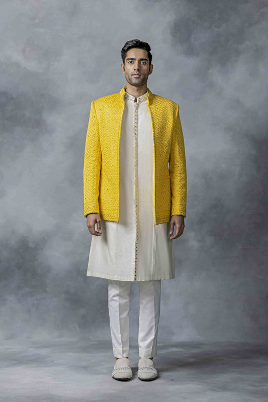 Yellow mirror work bandhgala set
