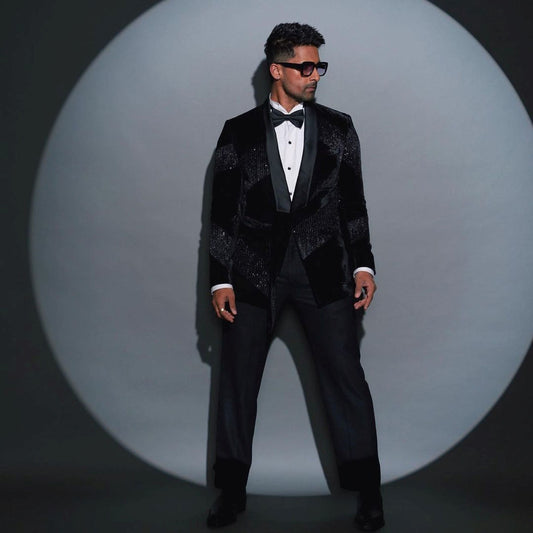 Ravi dubey in black tuxedo highlighted with sequin embellishment