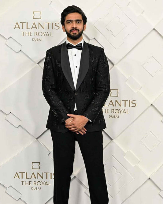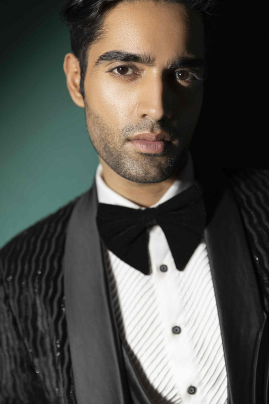 Amaal mallik in black broken stripe tuxedo with pearl highlights