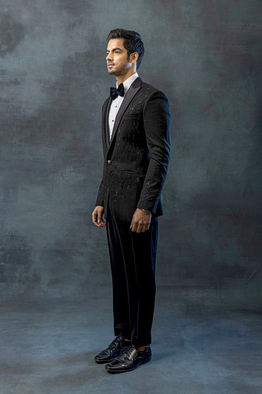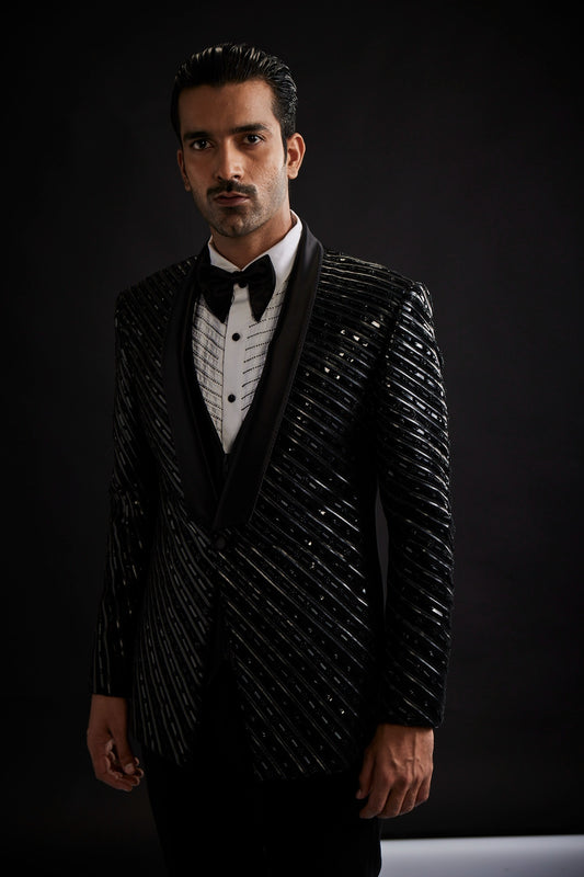 Black broken stripe tuxedo with pearl highlights