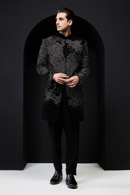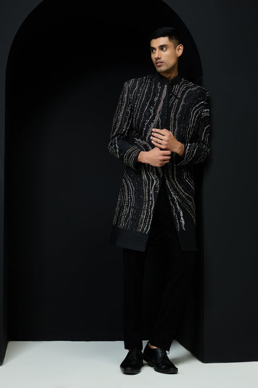 Black indo western highlighting with gold zari sequins pearl and cutdana
