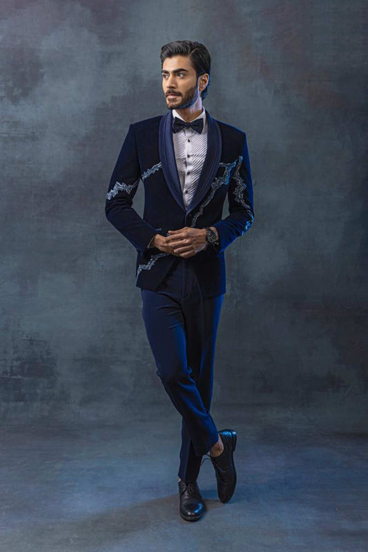 Blue velvet tuxedo with peal embellishment