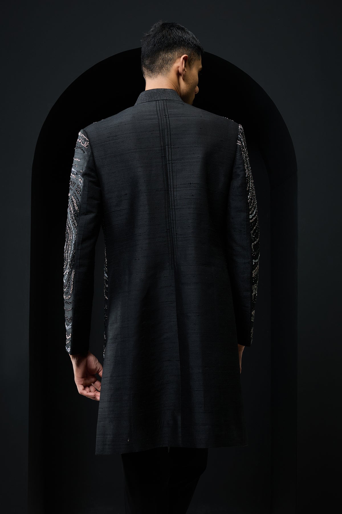 Black indo Western highlighting with silver zari, pearls and cutdana paired with pants paired with pants