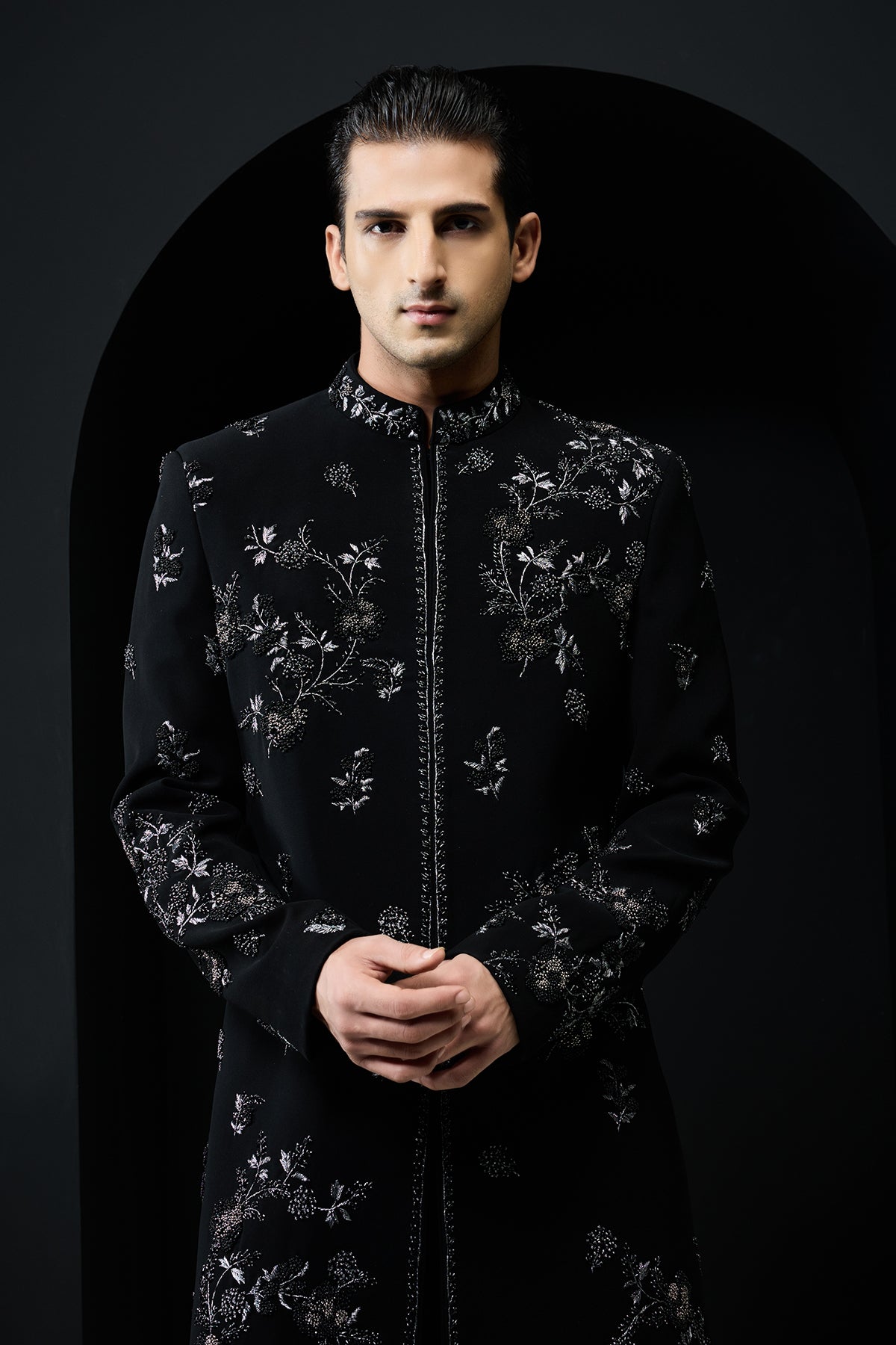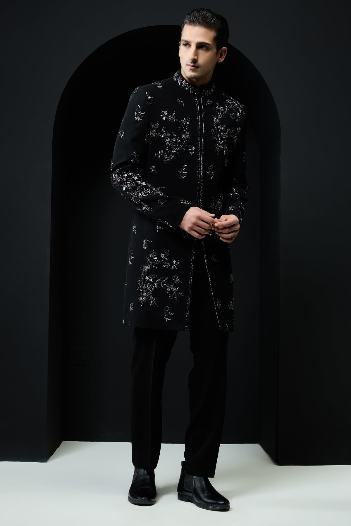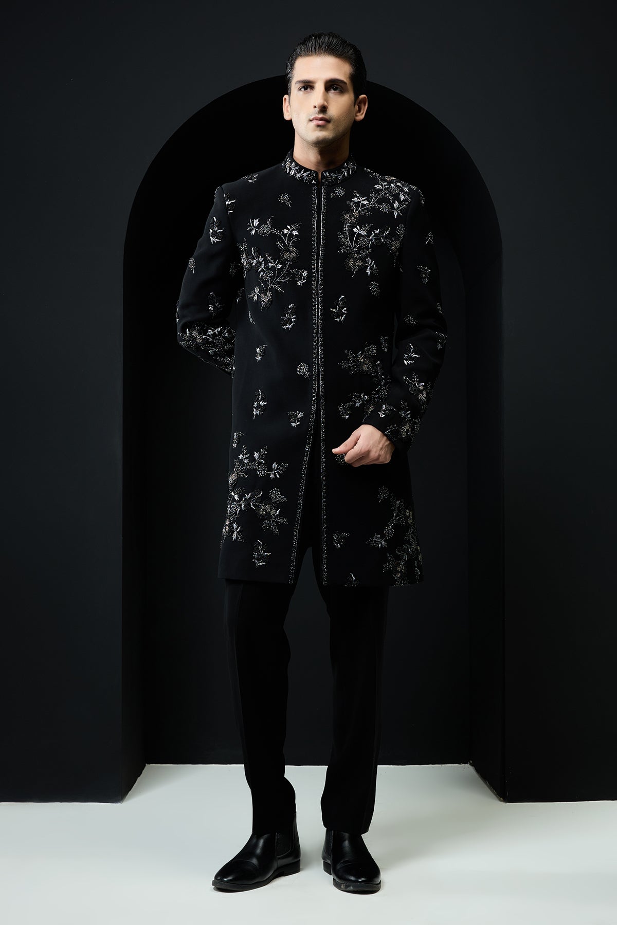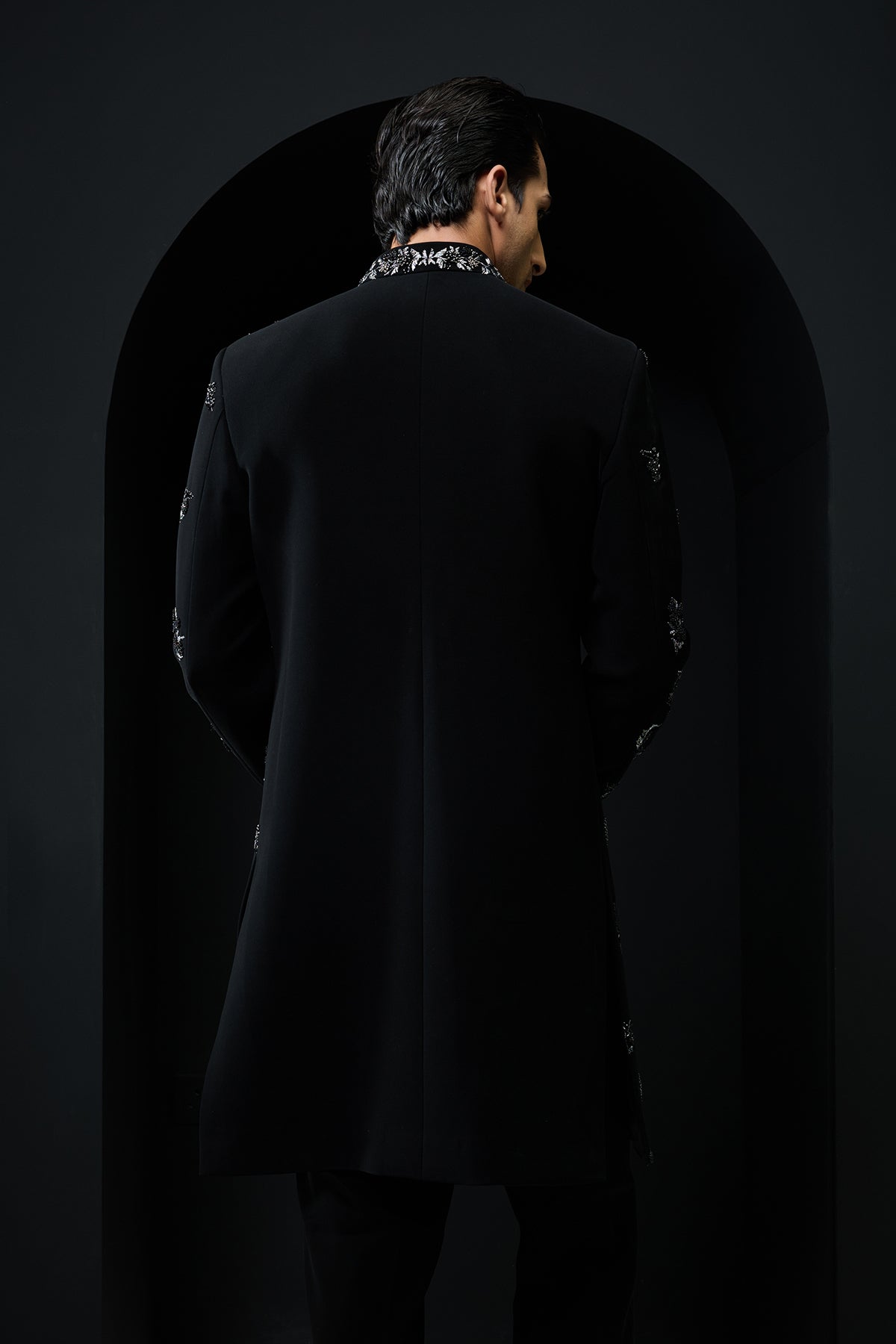 Black indo Western highlighting with silver zari, pearls and cutdana paired with pants