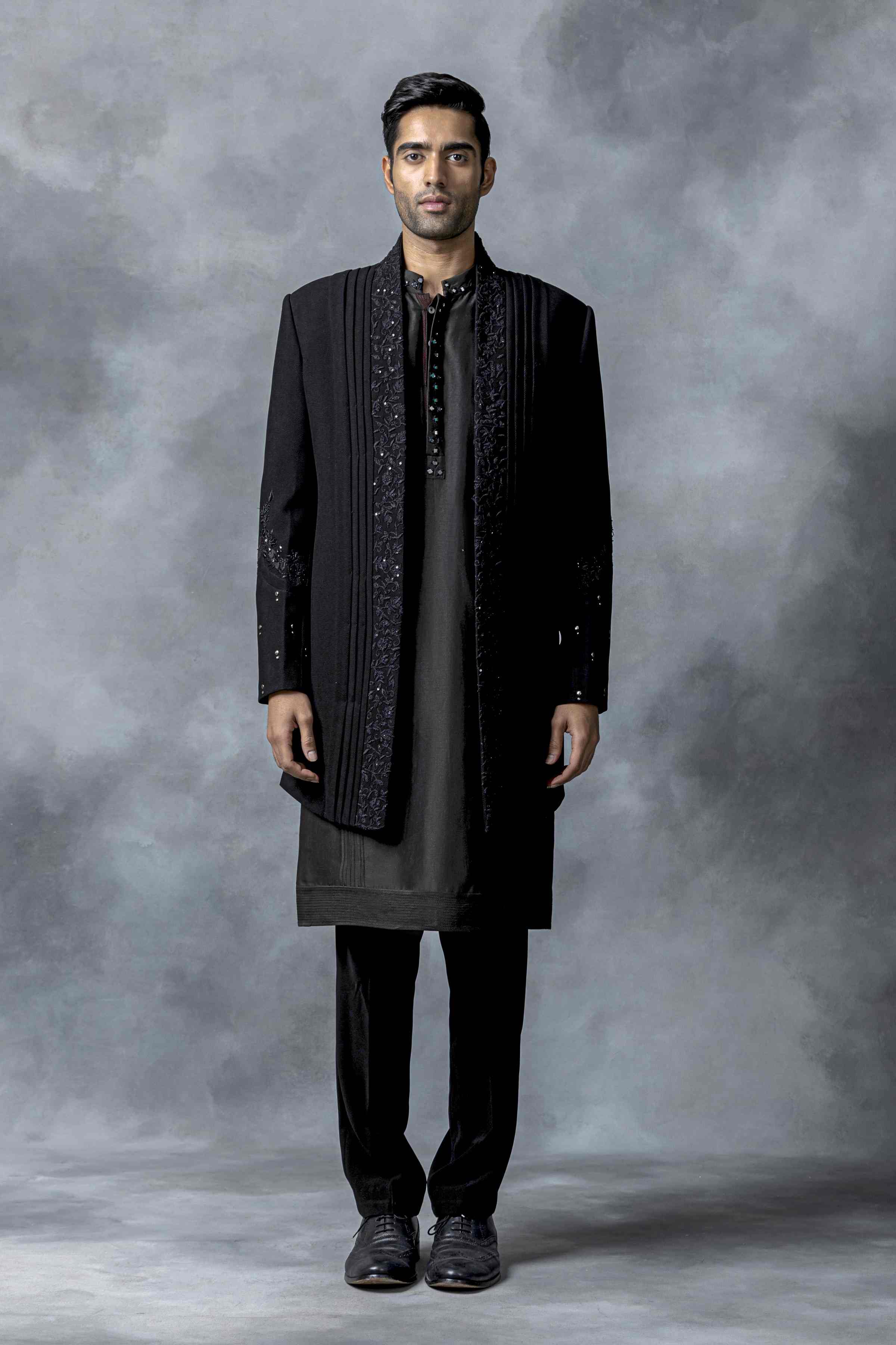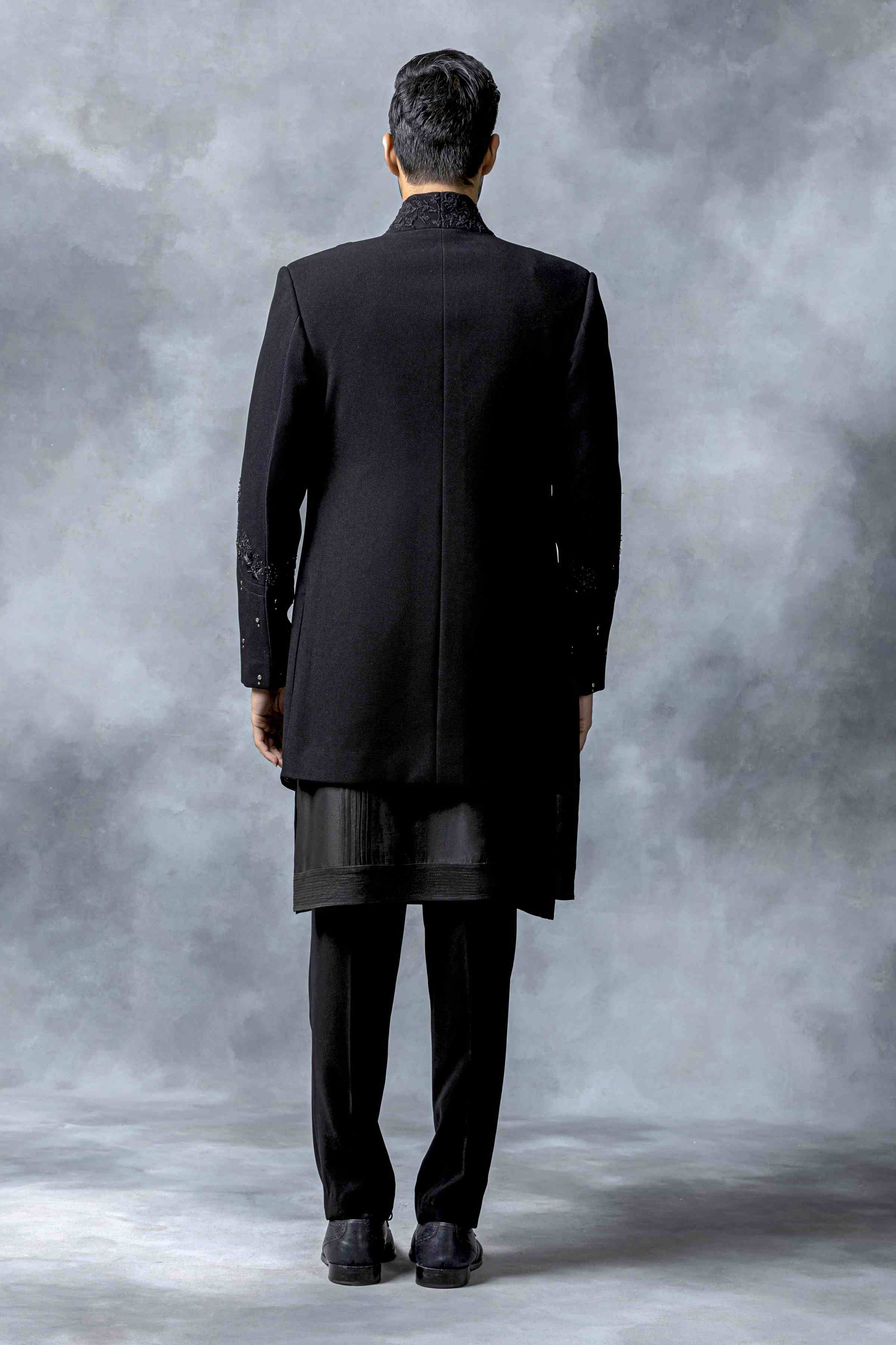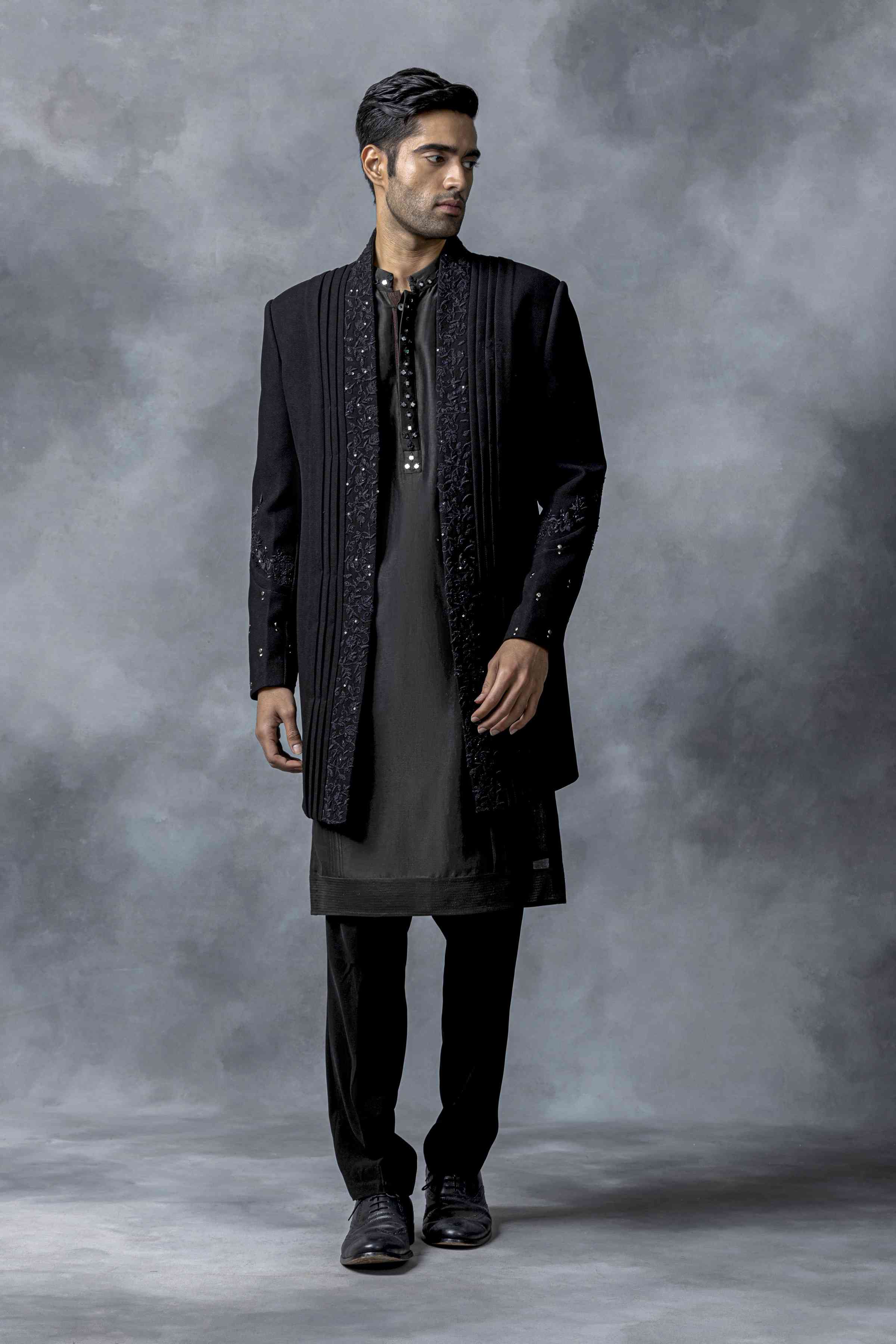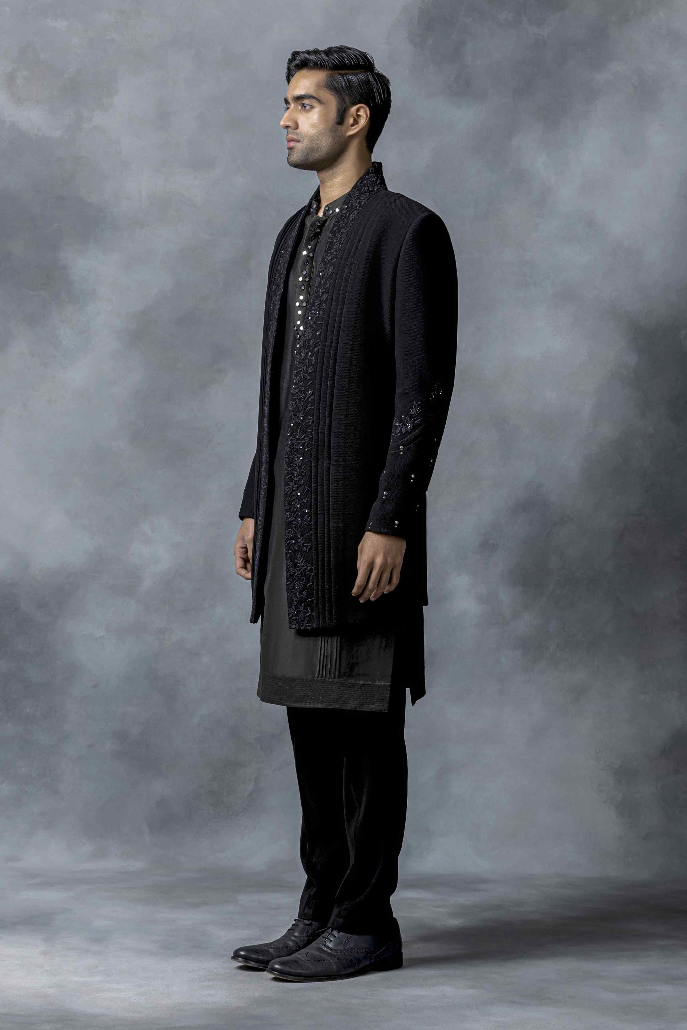 Featuring Black Open Indo-Western With Pleated Front Highlighted With Thread Work, Sequin And Rivet Paired With Kurta And Pants