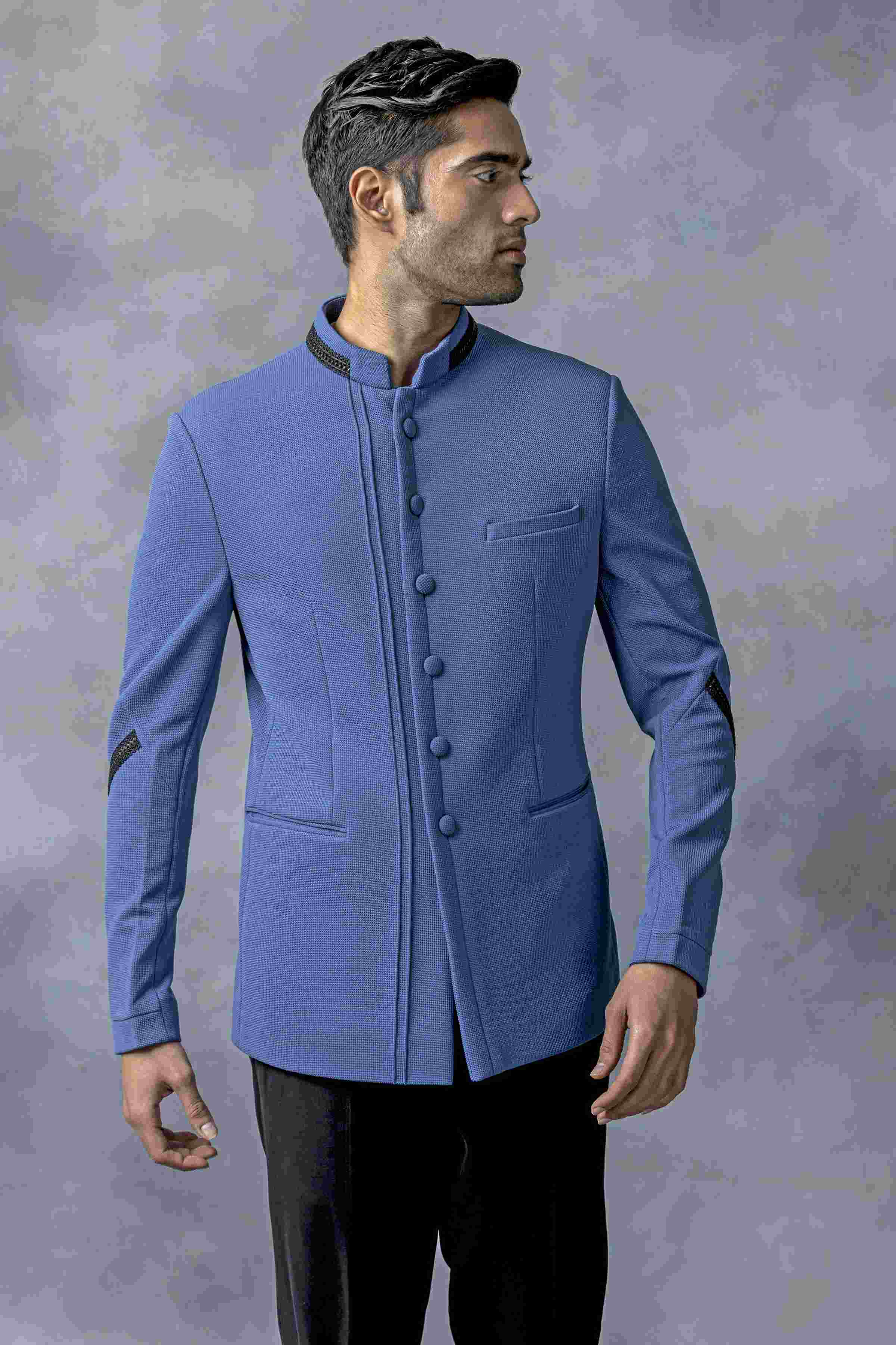 Featuring Blue Bandhgala With Black Leather Tape Detailing Paired With Pants