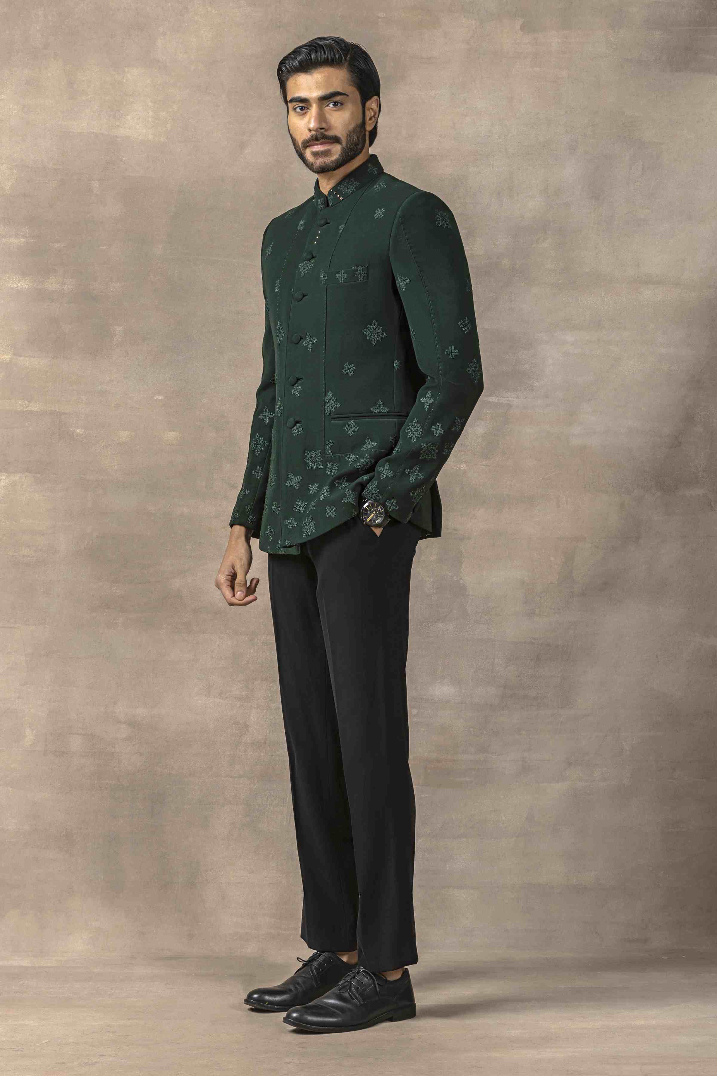 Featuring Dark Green Bandhgala With French Knot Wok Paired With Pants