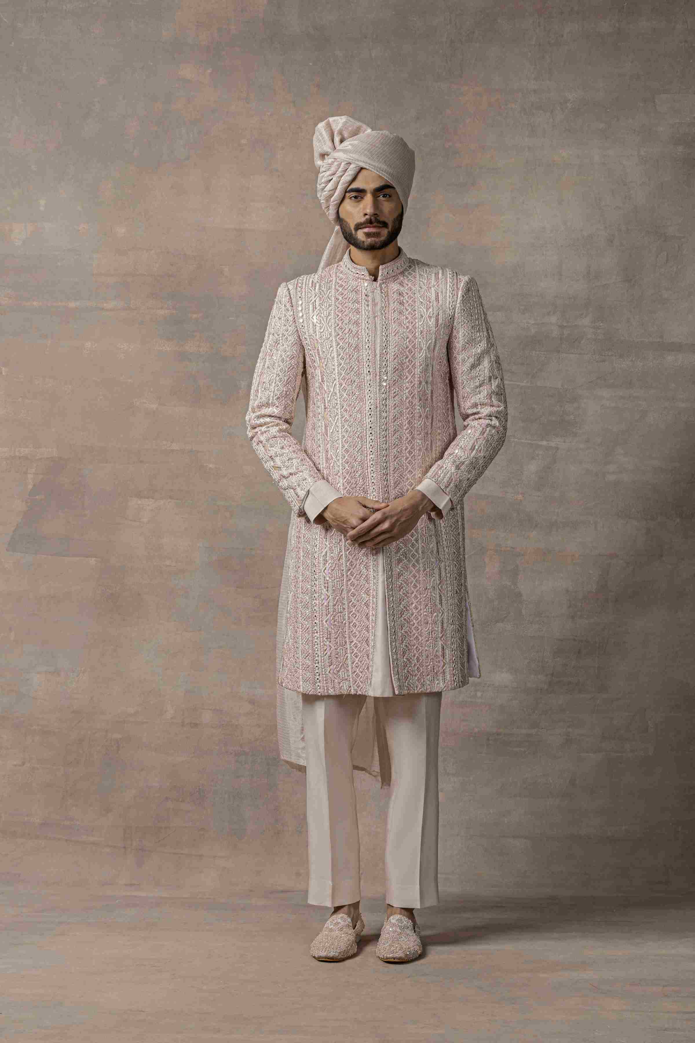 Featuring Dust Rose Sherwani Highlighted With Mirror, Pearl And Thread Work Paired With Kurta, Pants , Shoes, Dupatta & Safa Fabric