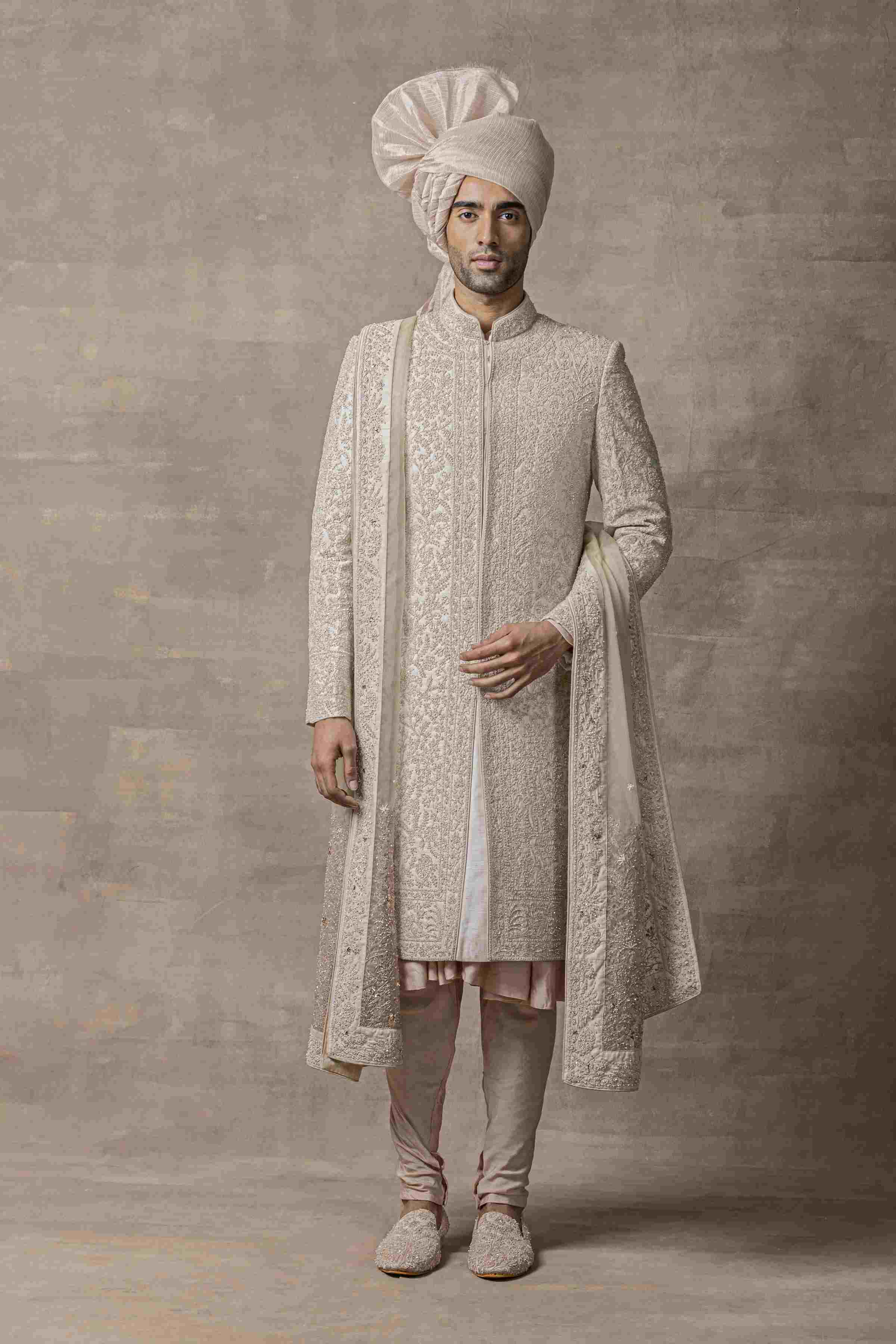 Featuring Dusty Rose Sherwani With Thread Work Highlighted With Pearl And Sequin Work Paired With Kurta, Pant, Shoes , Dupatta And Safa Fabric