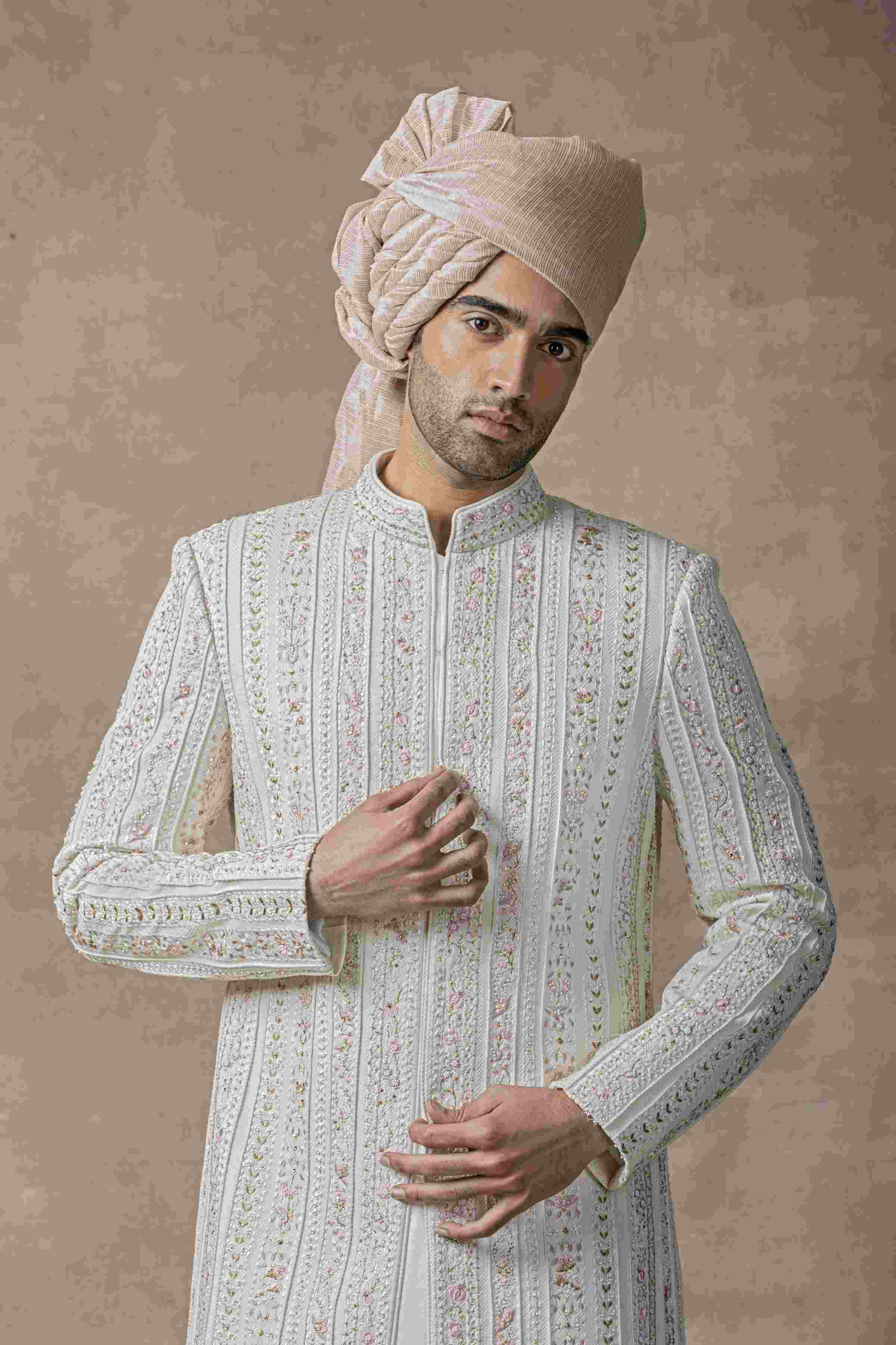Featuring Ivory Sherwani Highlighted With Thread And Pearl Work Paired With Kurta, Pants , Shoes, Dupatta & Safa Fabric