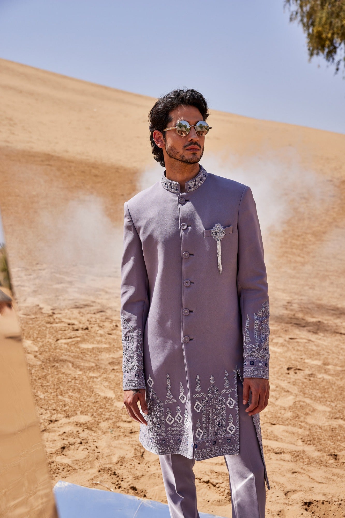 Featuring Lavender Indo-Western Highlighted With Ivory And Teal Thread And Pearl Work Paired With Pants