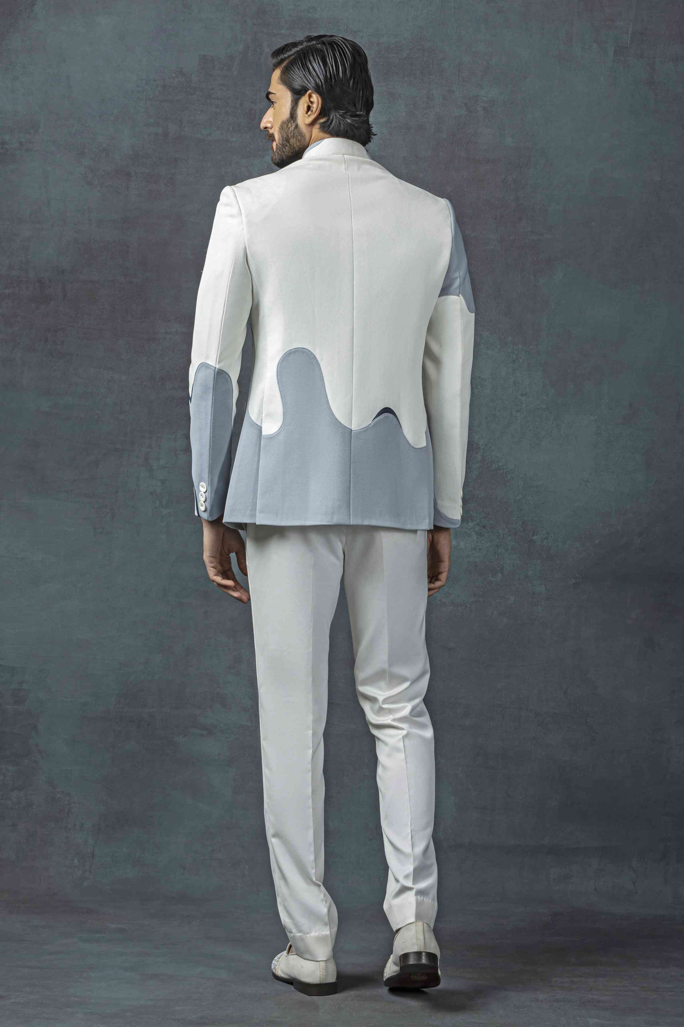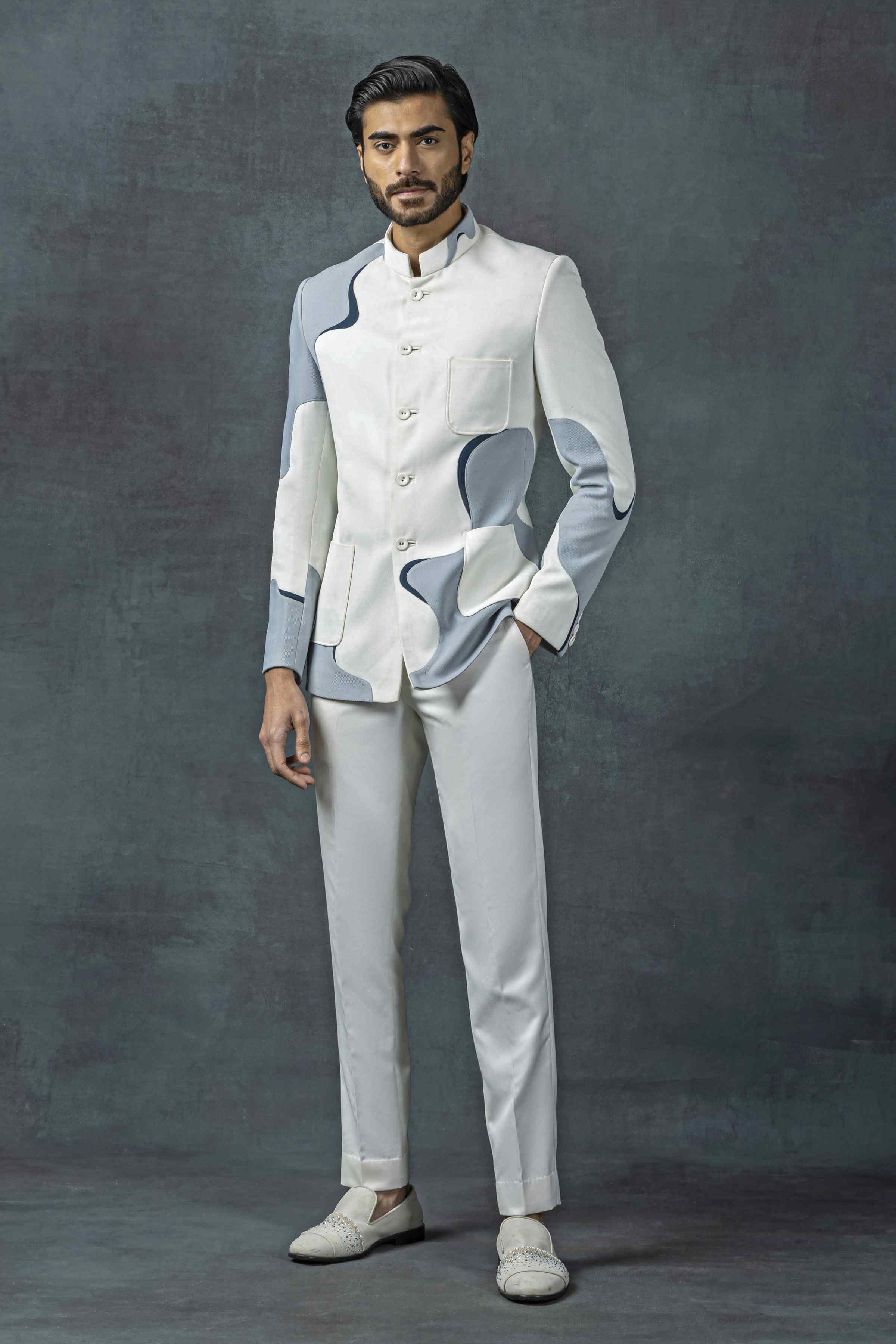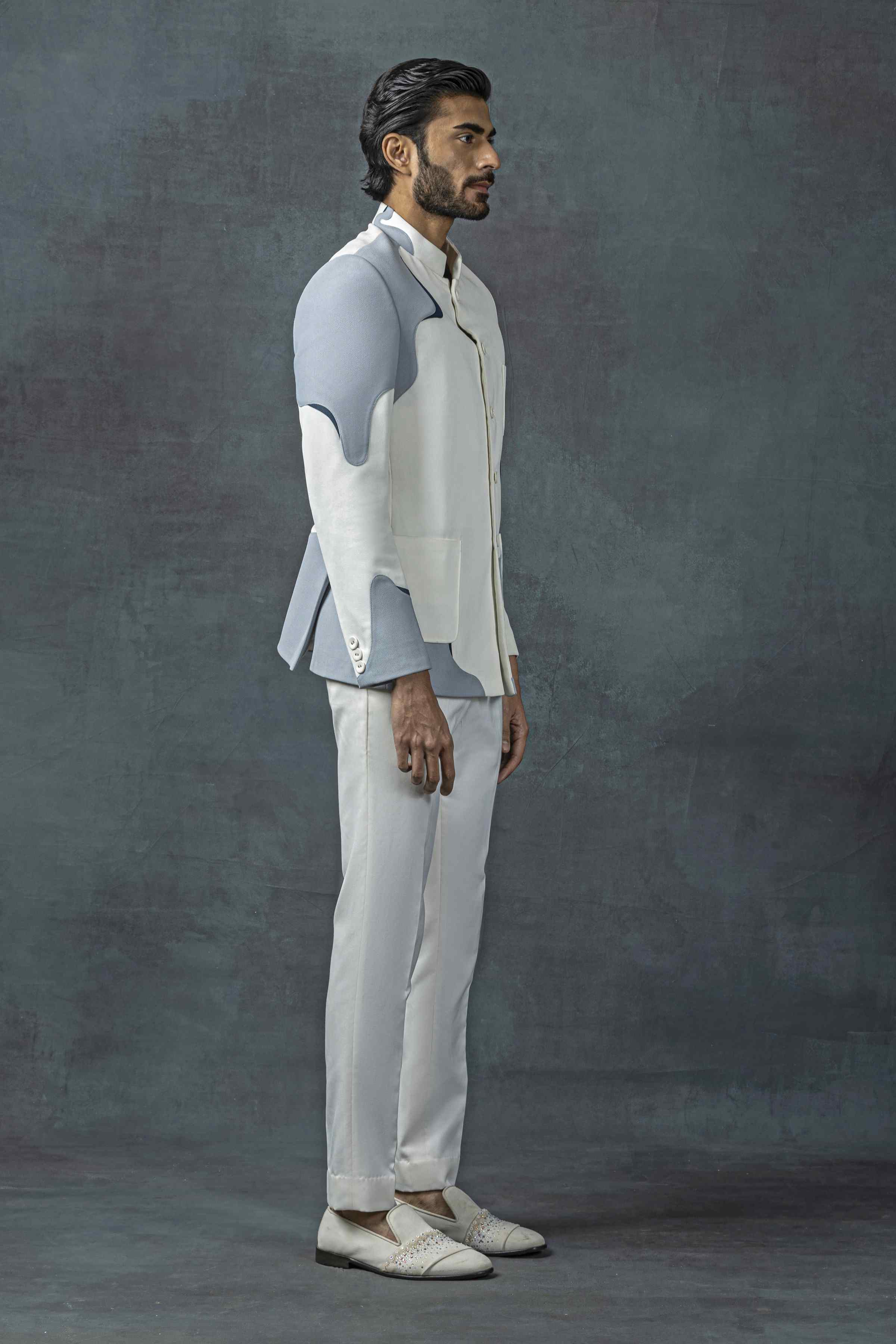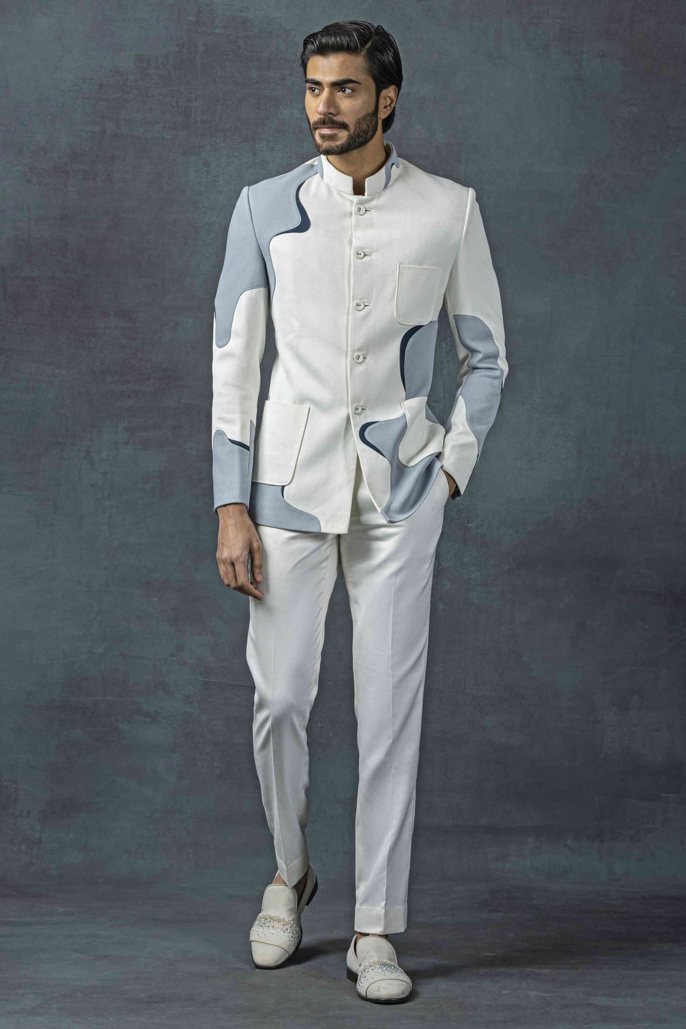 Featuring An Off White Bandhgala With Grey Applique Work Paired With Pants