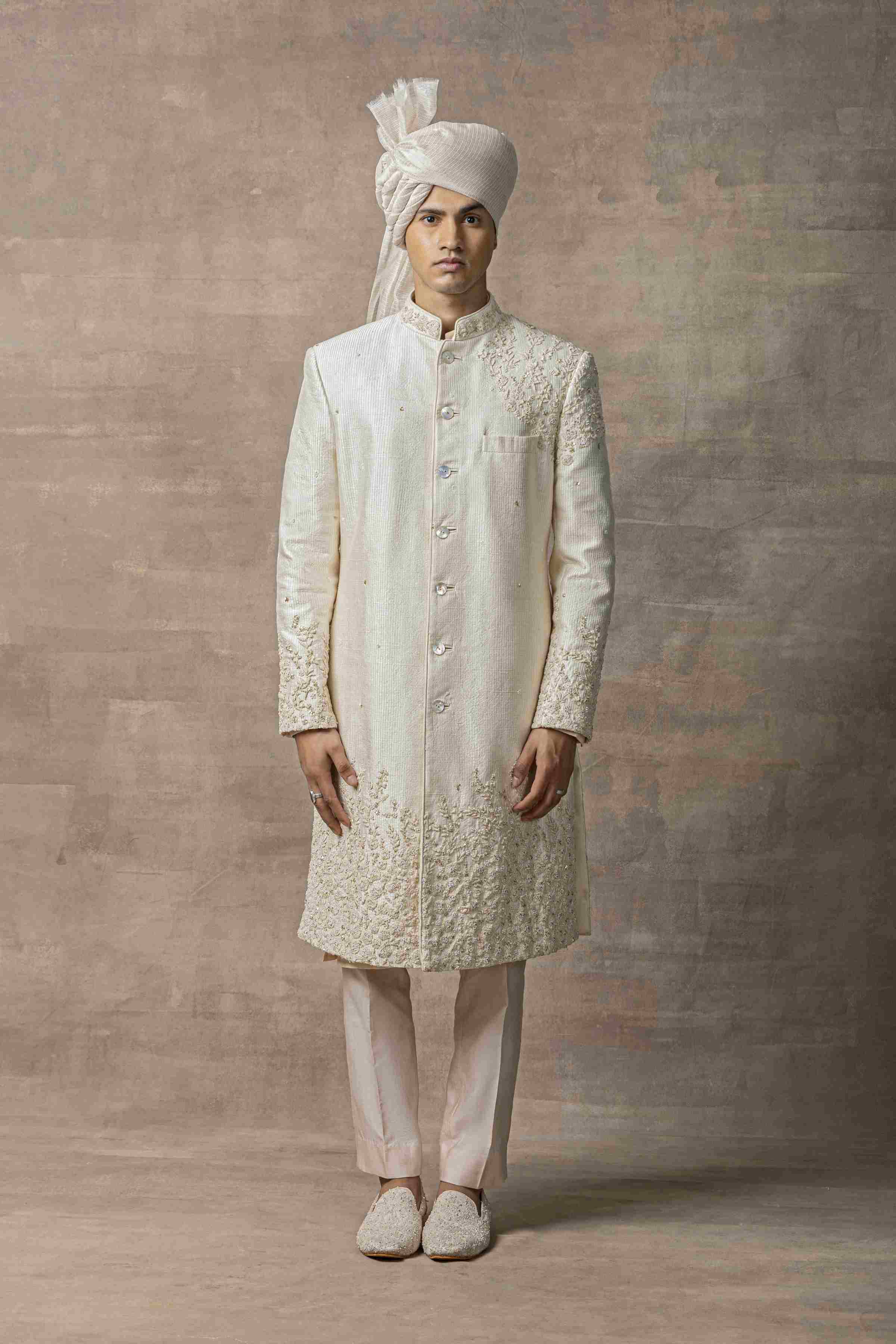 Off White Dhagai Sherwani With Placement Dori Work Highlighted With Pearl And Sequin