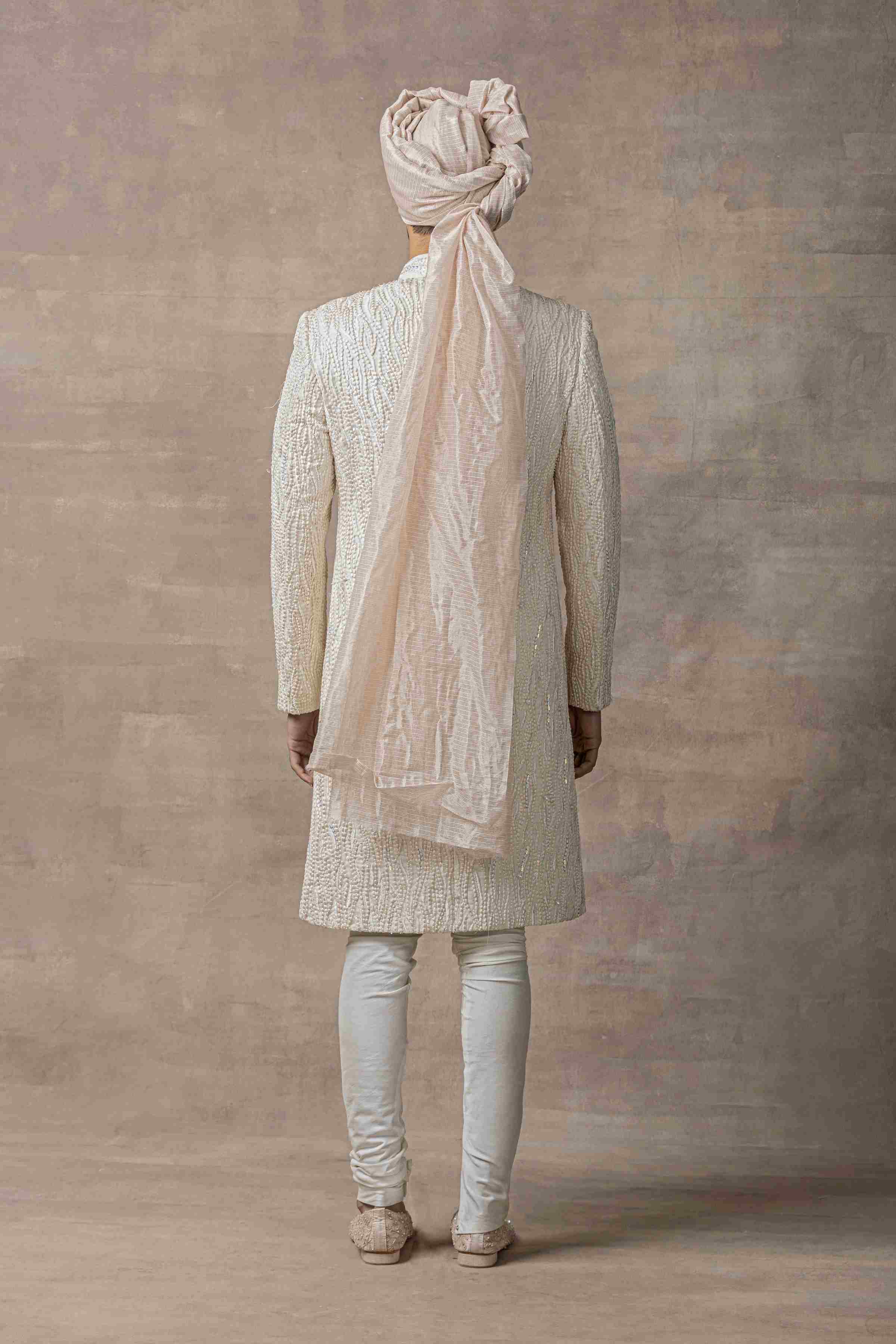 Featuring An Off White Dhagai Sherwani With Placement Dori Work Highlighted With Pearl And Sequin Paired With Shoes, Kurta Dupatta, Pant And Safa Fabric