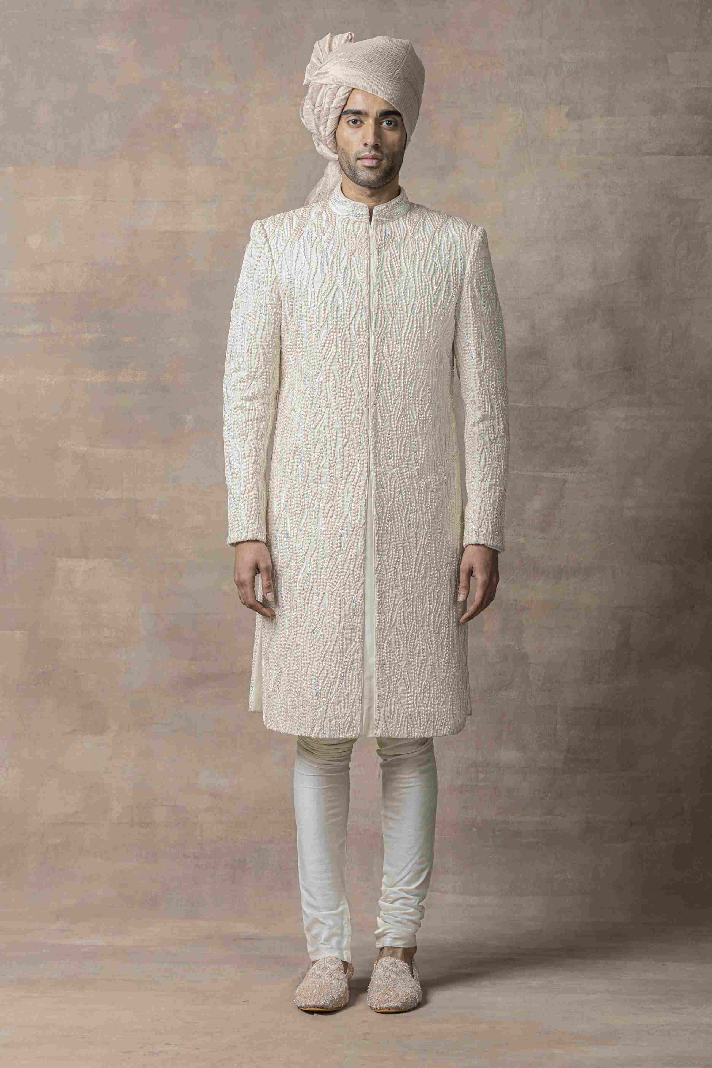 Featuring An Off White Sherwani Highlighted With Thread , Pearl And Multi Coloured Sequin Paired With Kurta , Pants , Shoes ,Dupatta And Safa Fabric