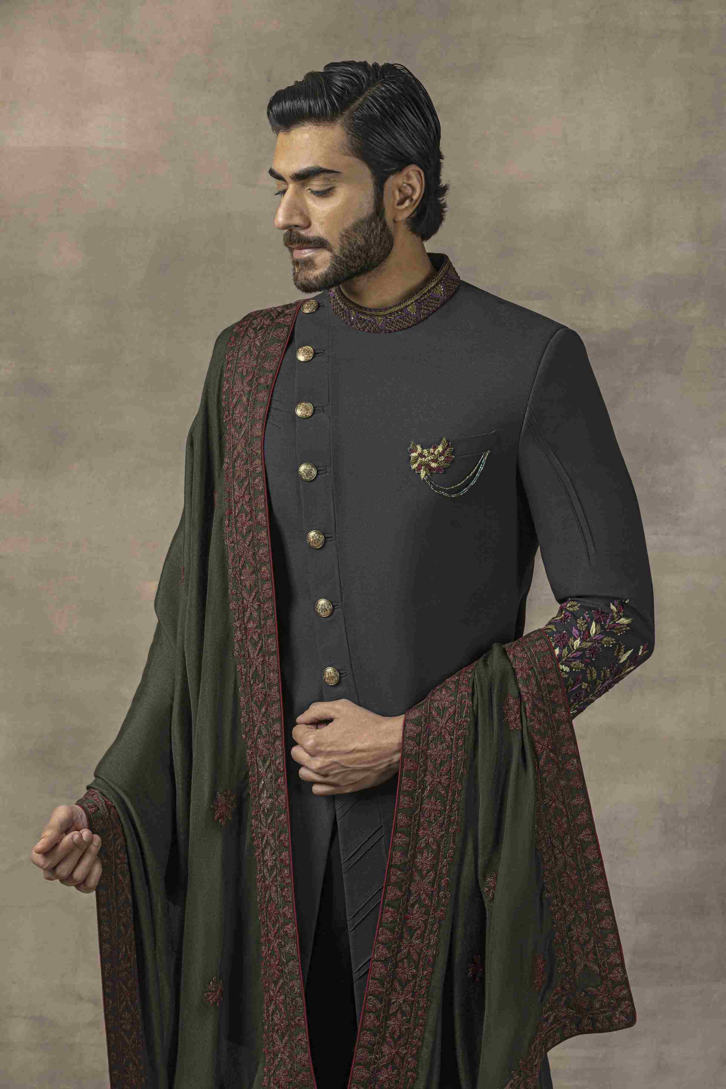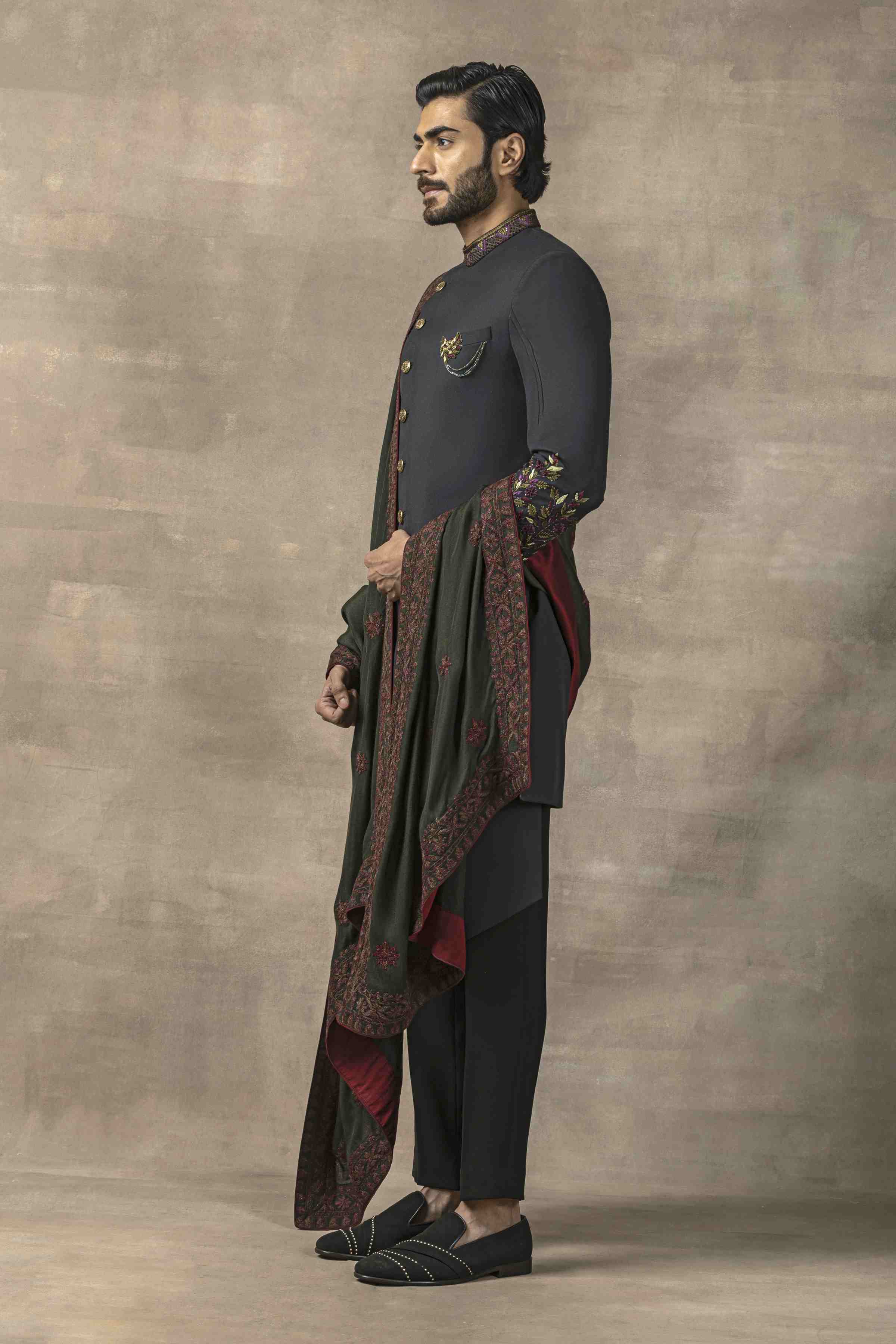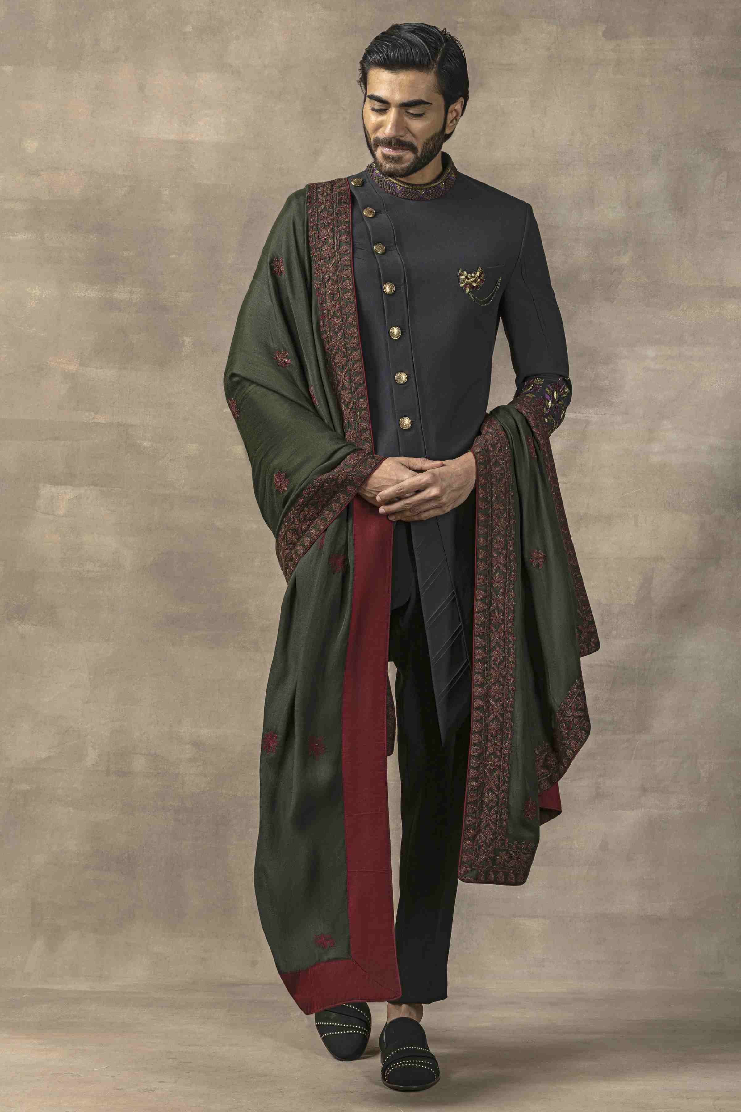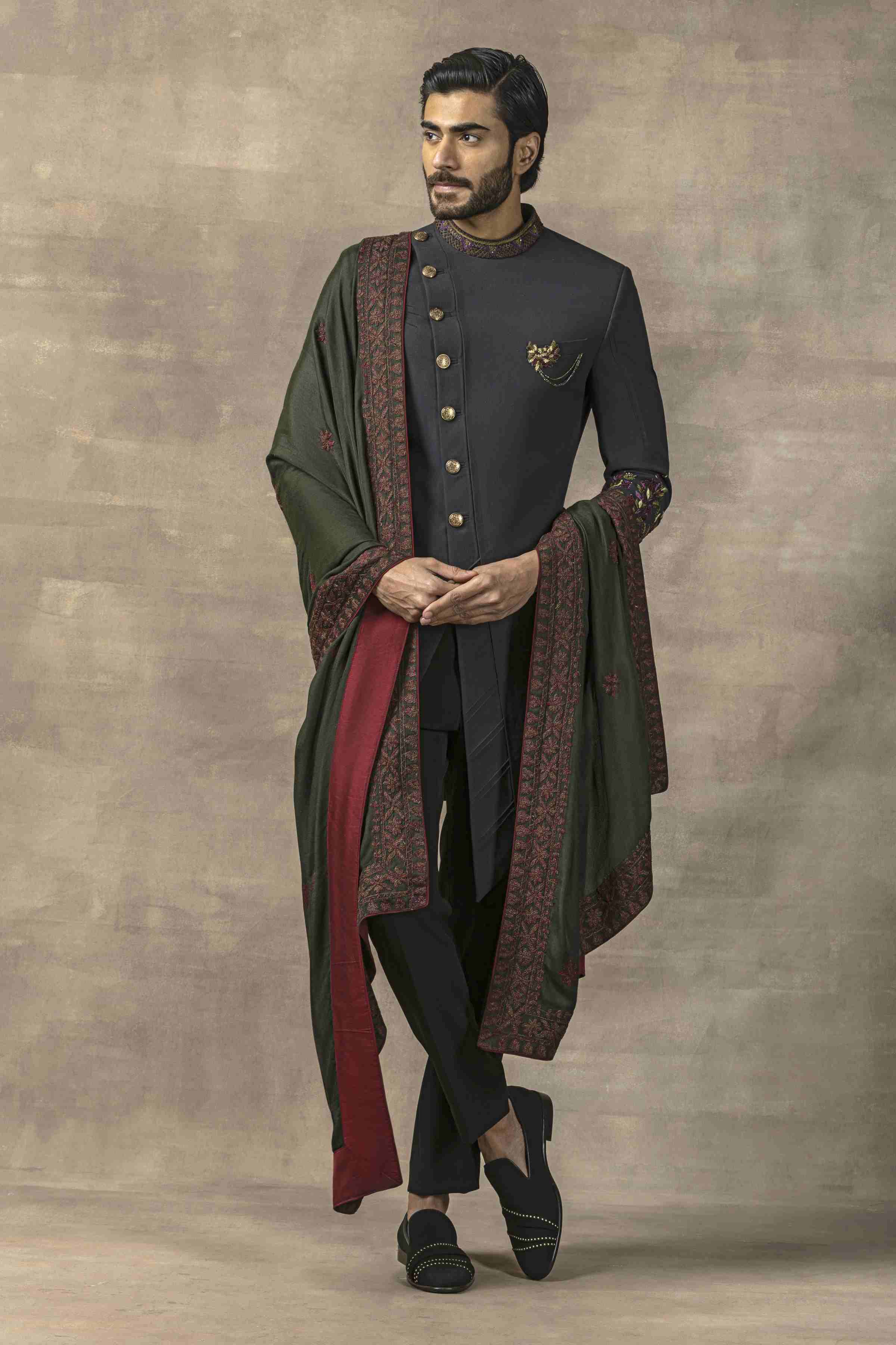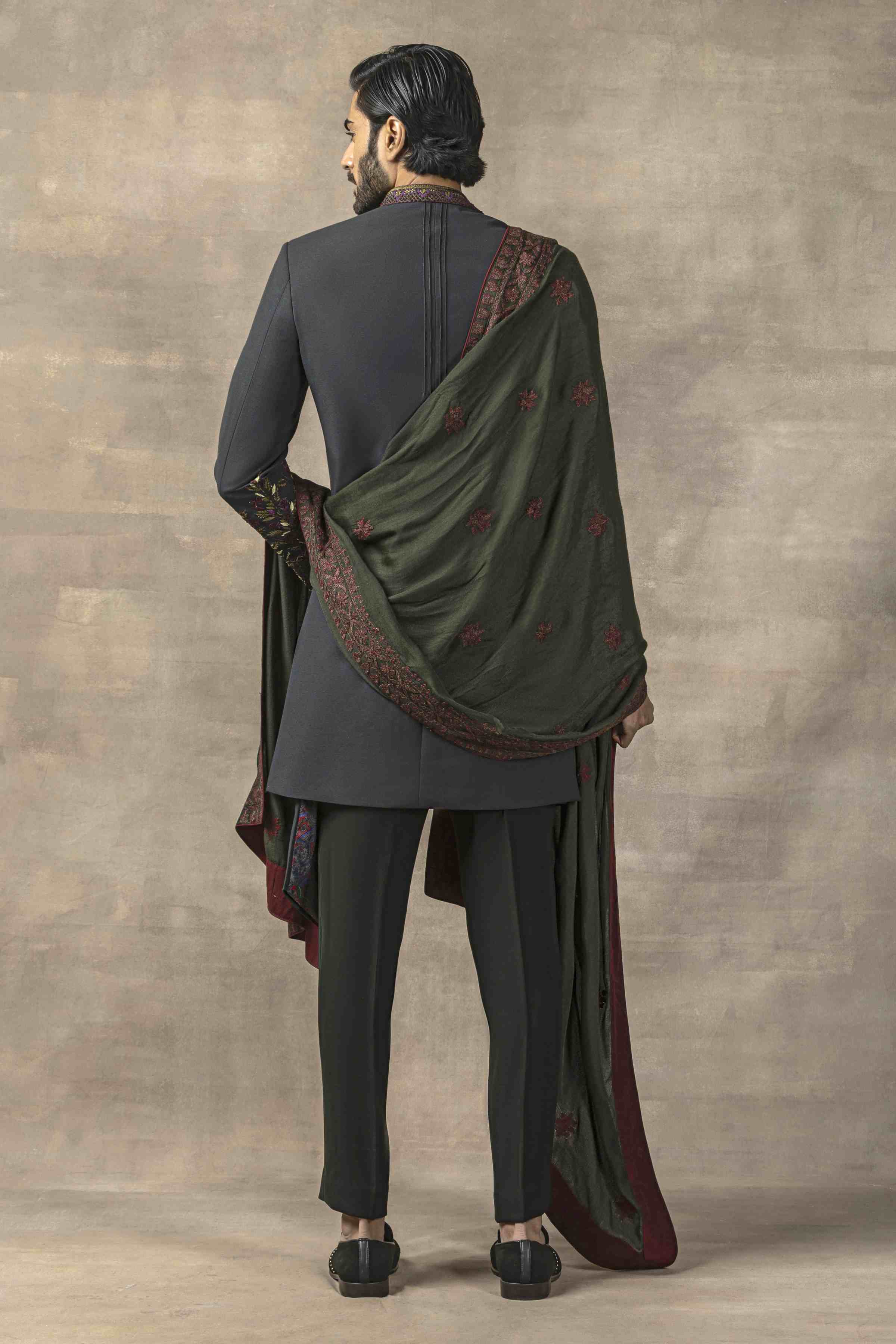 Featuring Olive Indo-Western Highlighted With Seven Colour Thread Spring Work Paired With Thread Work Shawl And Pants