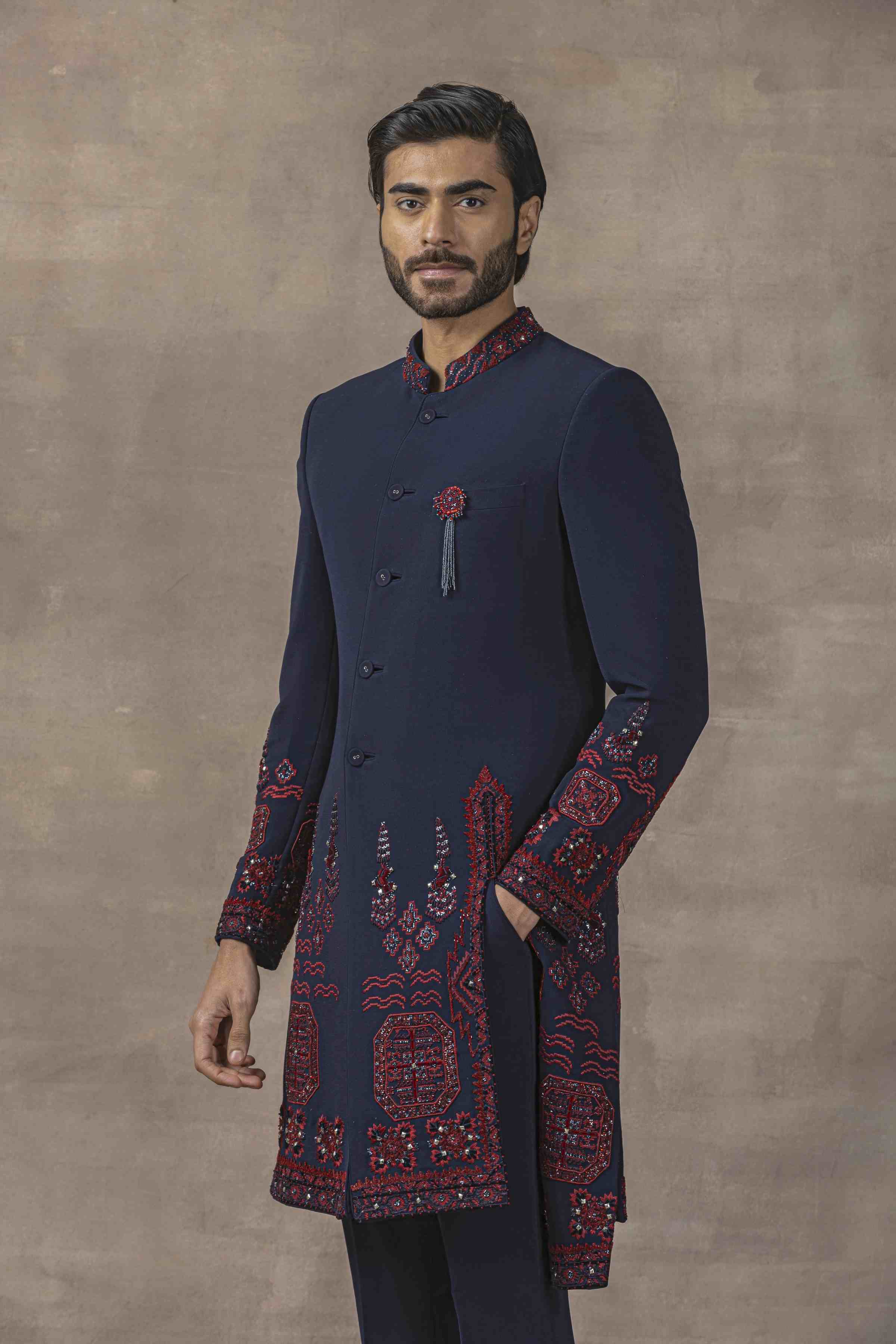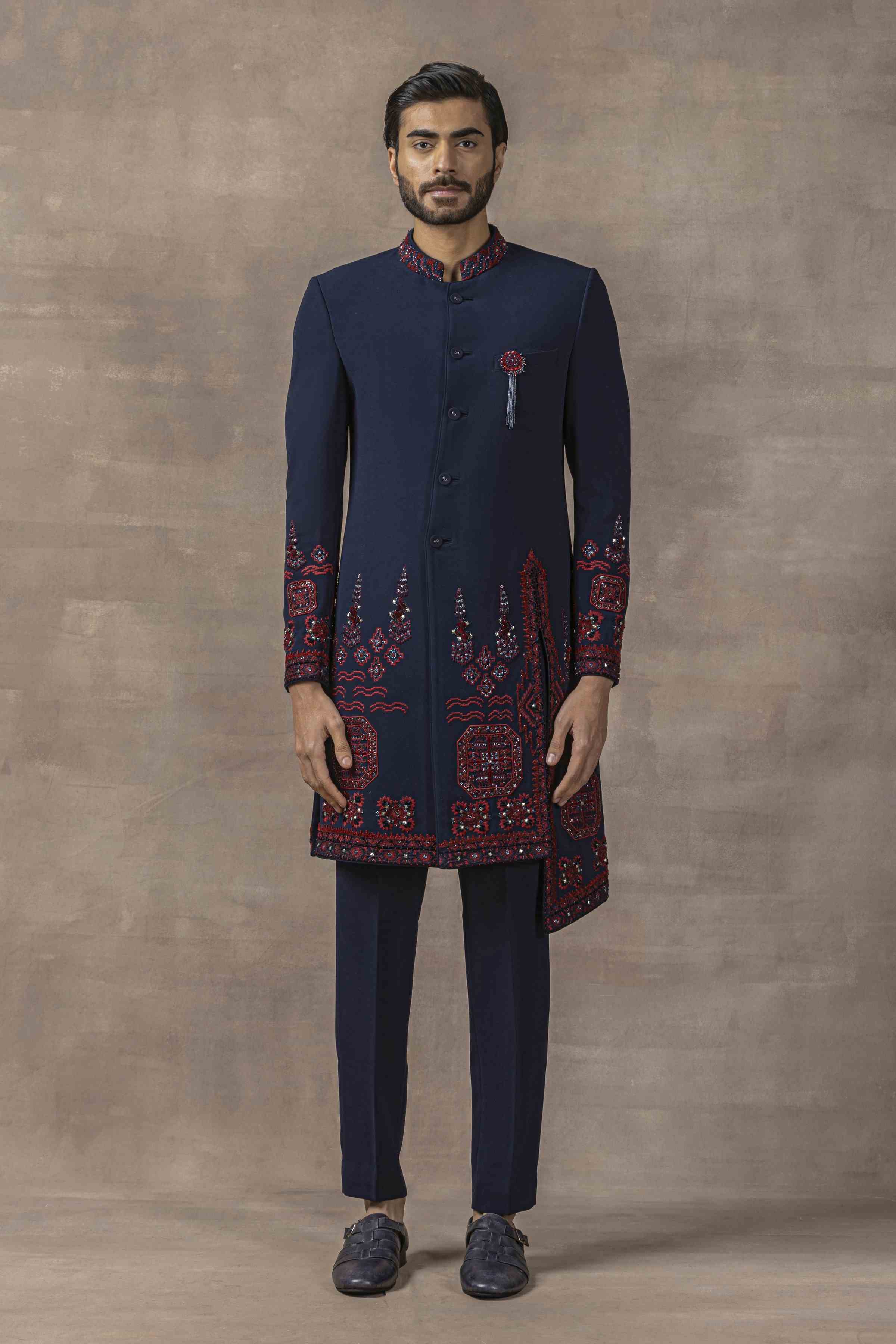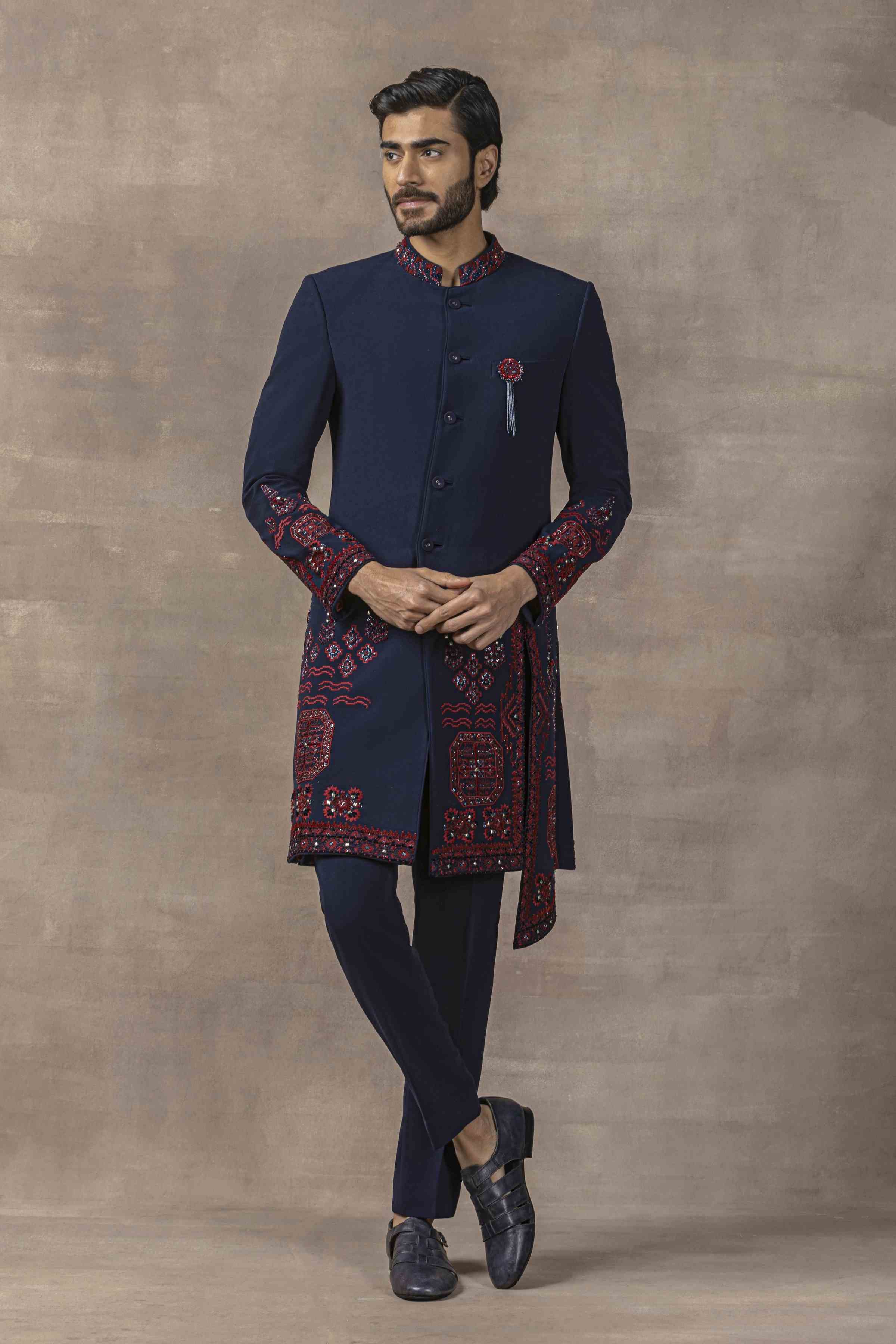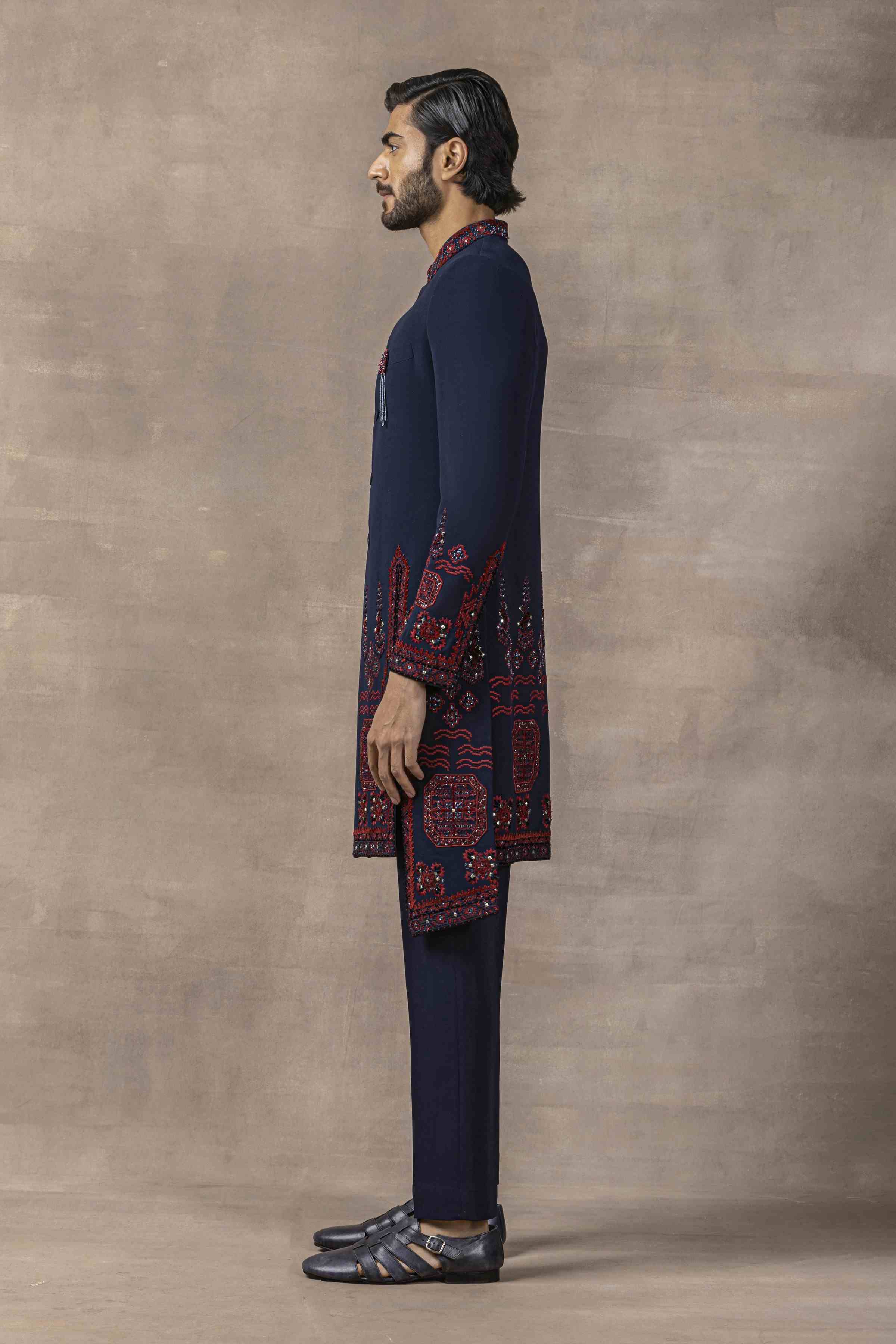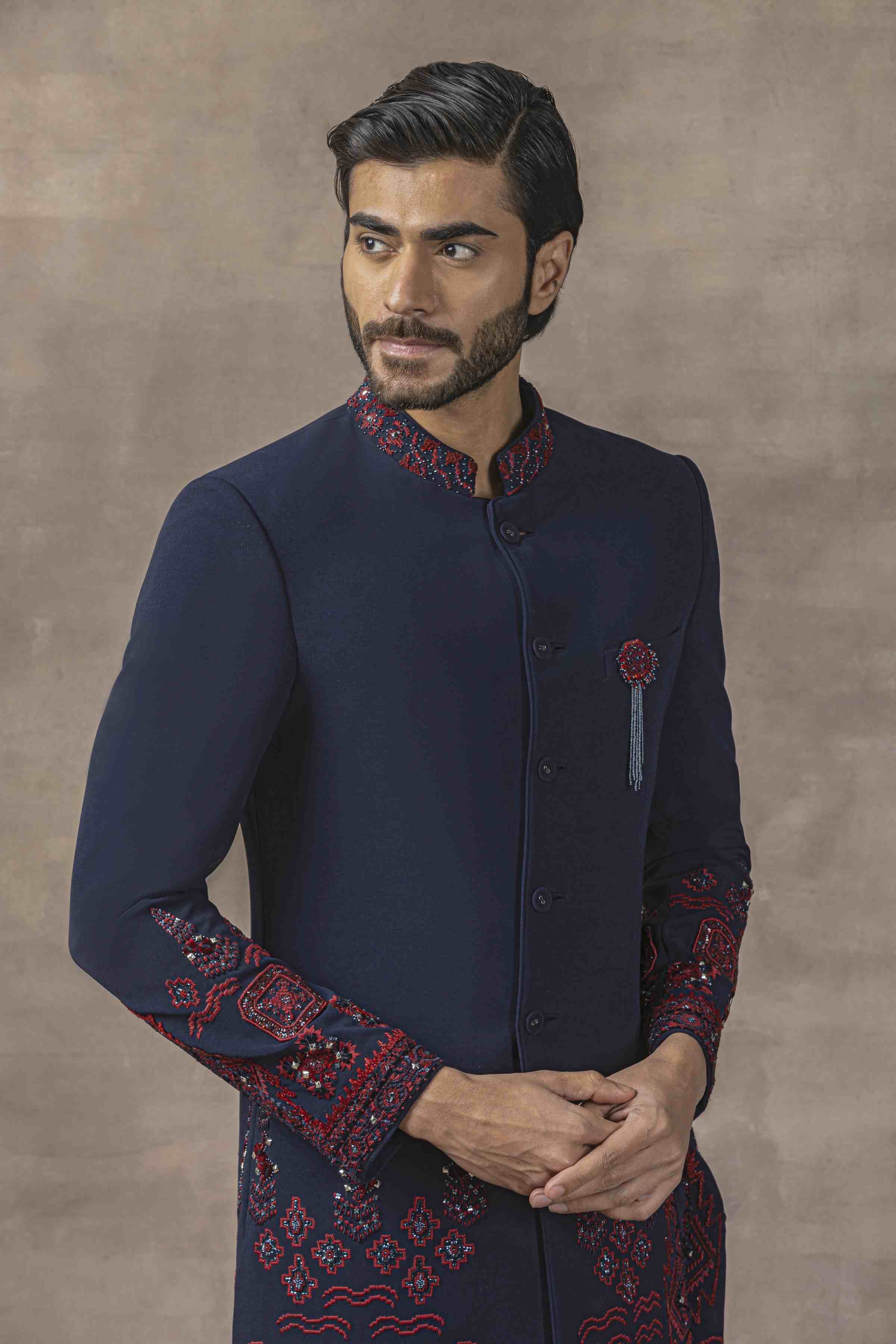 Featuring Navy Indo-Western Highlighted With Navy And Ox Blood Red Thread Work With Rivets Paired With Pants