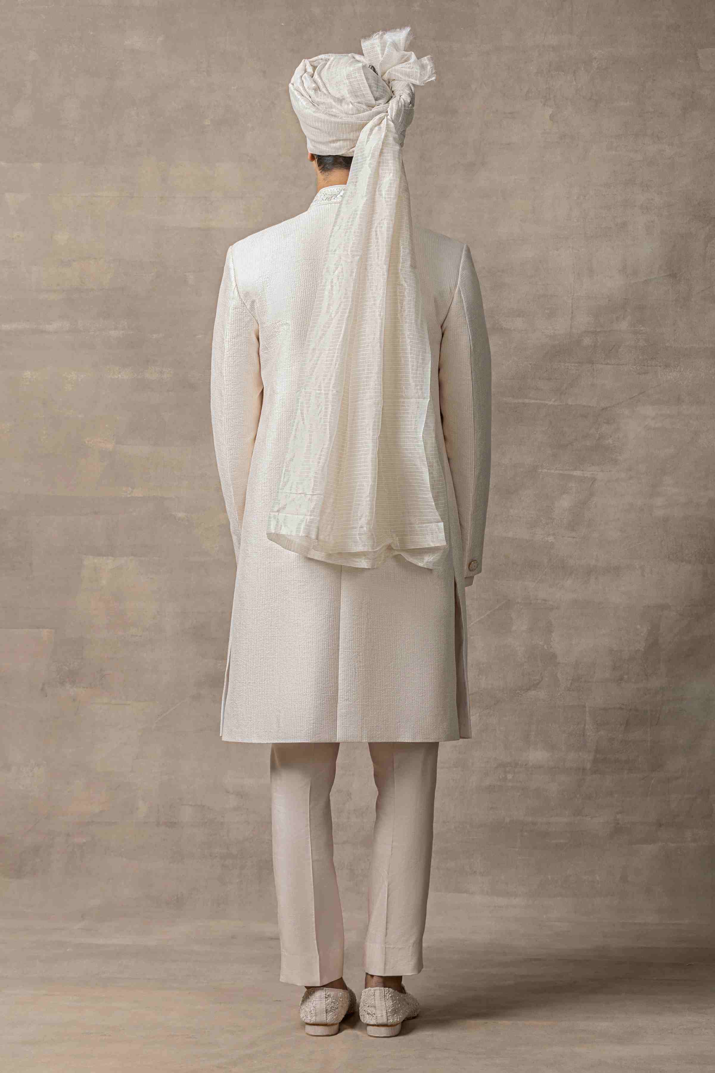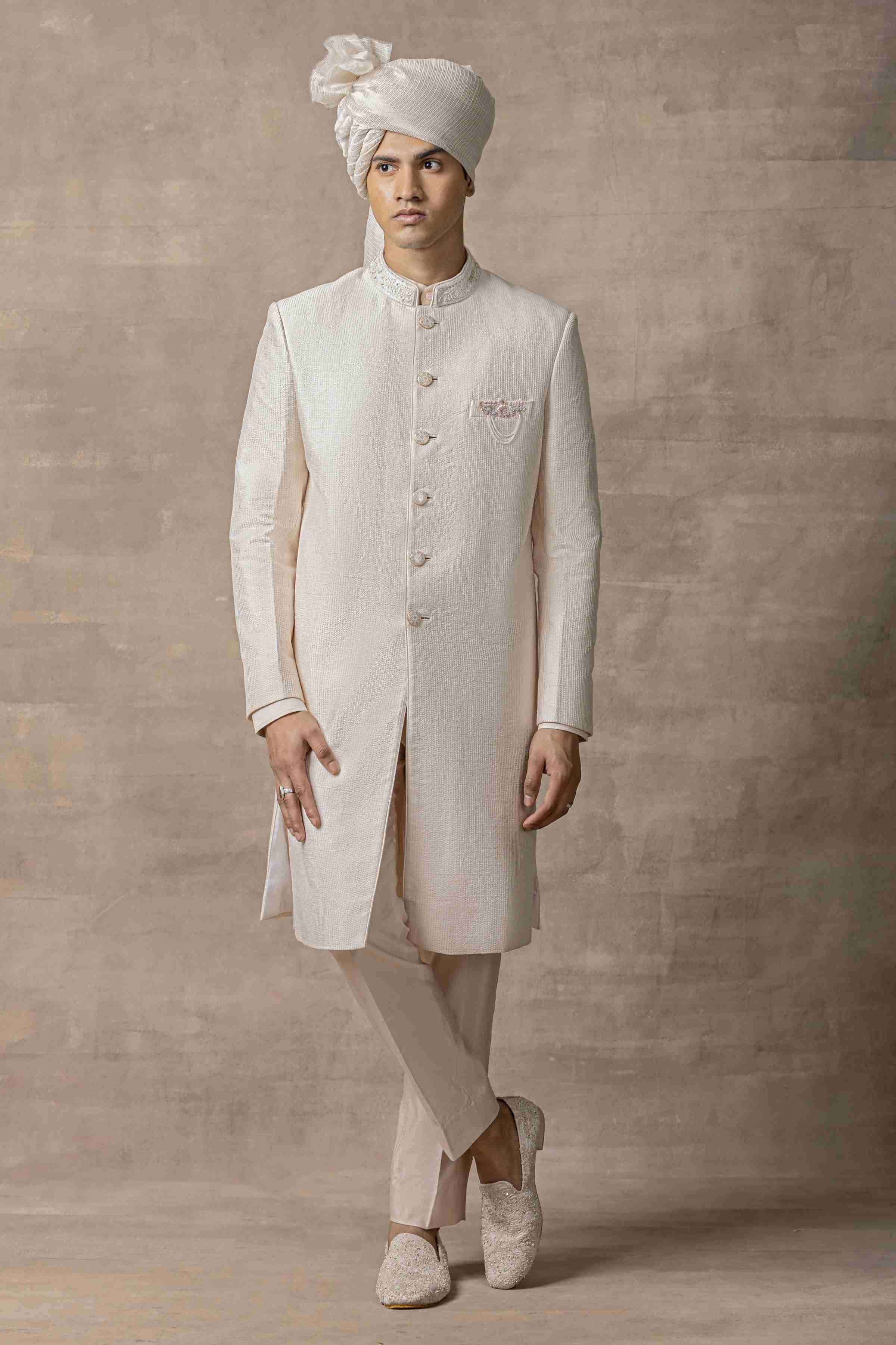 Featuring Rose Gold Sherwani Highlighted With Thread And Pearl Work Paired With Kurta And Pants