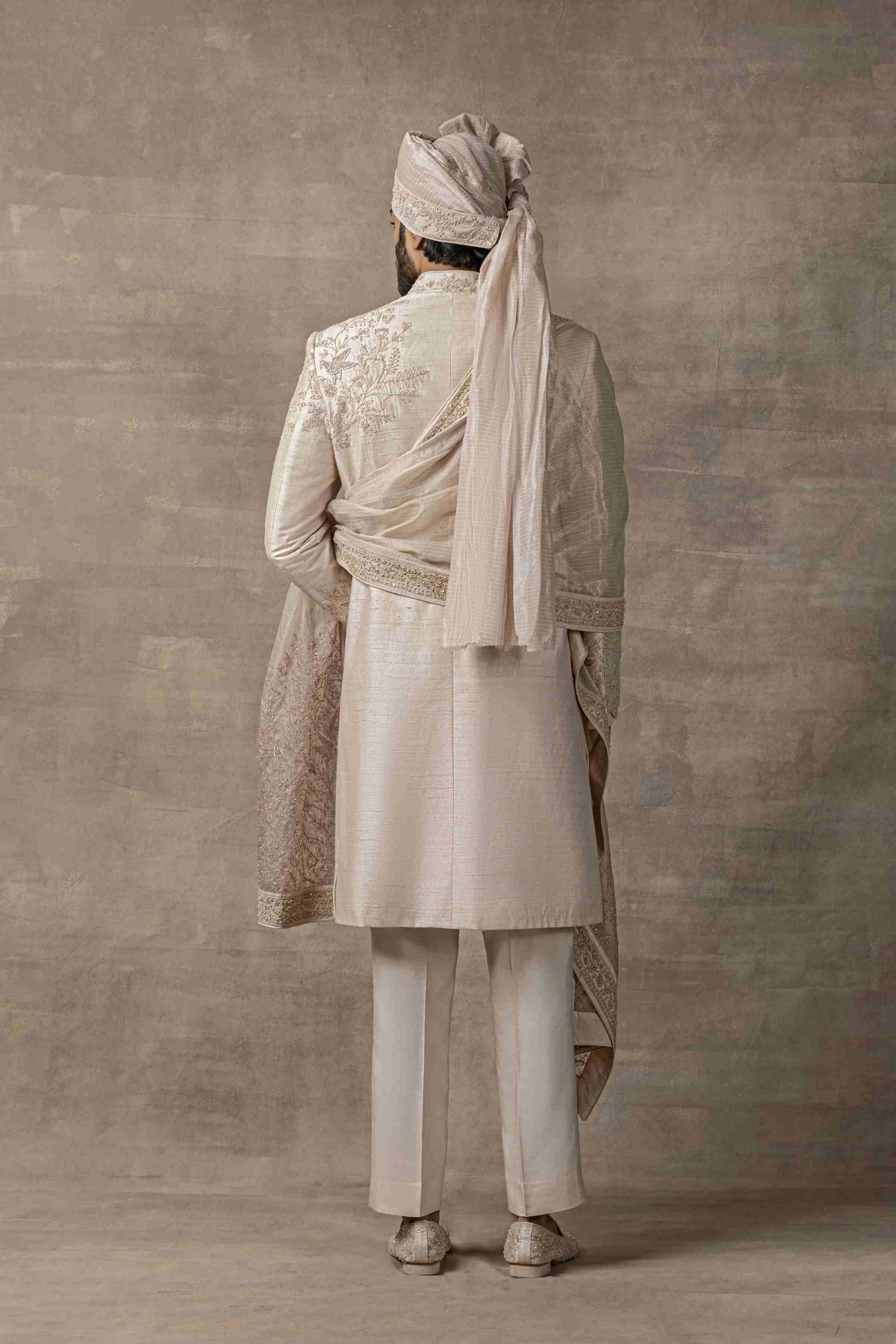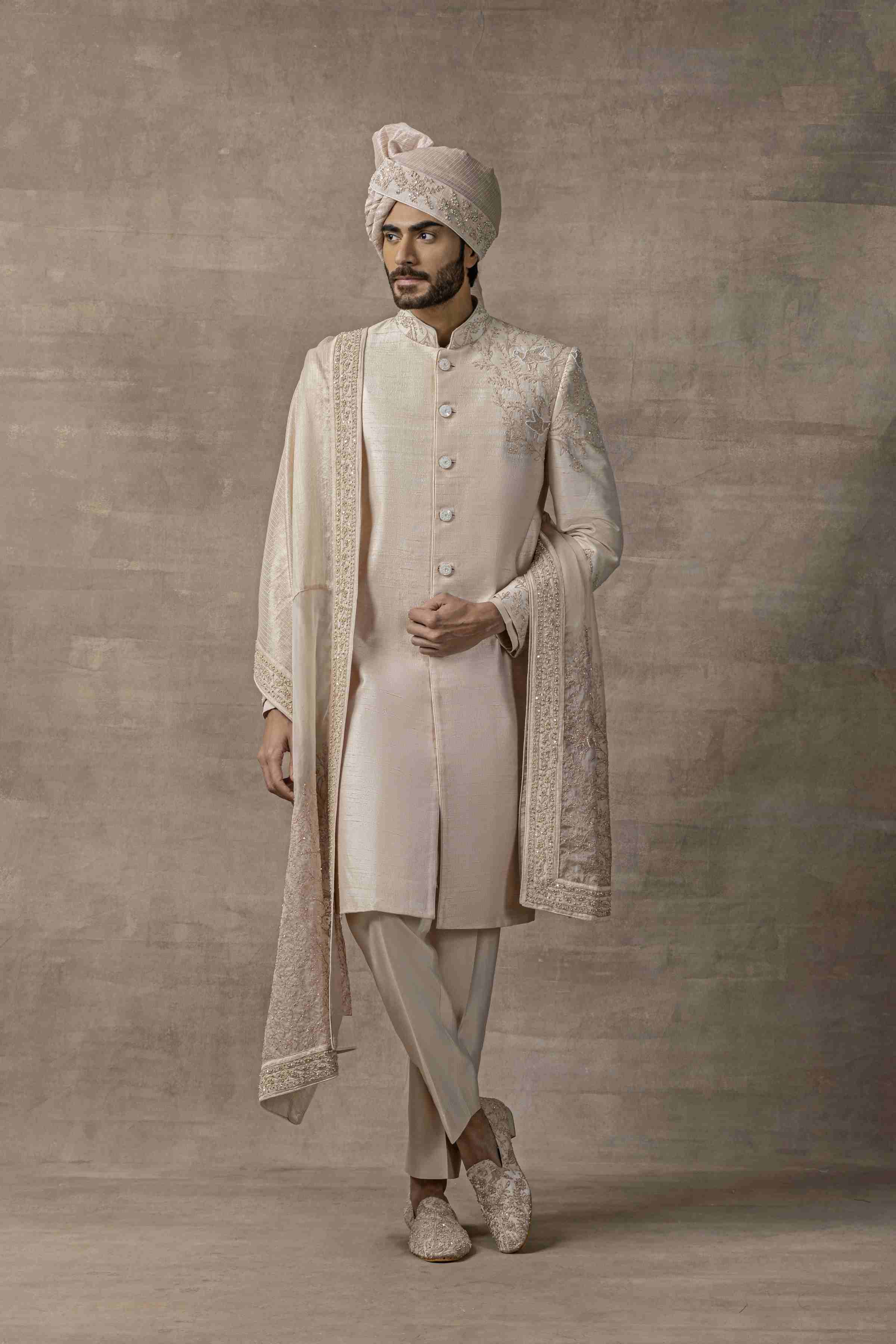 Featuring Rose Gold Sherwani With Placement Work On One Shoulder Paired With Kurta, Pants, Shoes, Dupatta & Safa Fabric