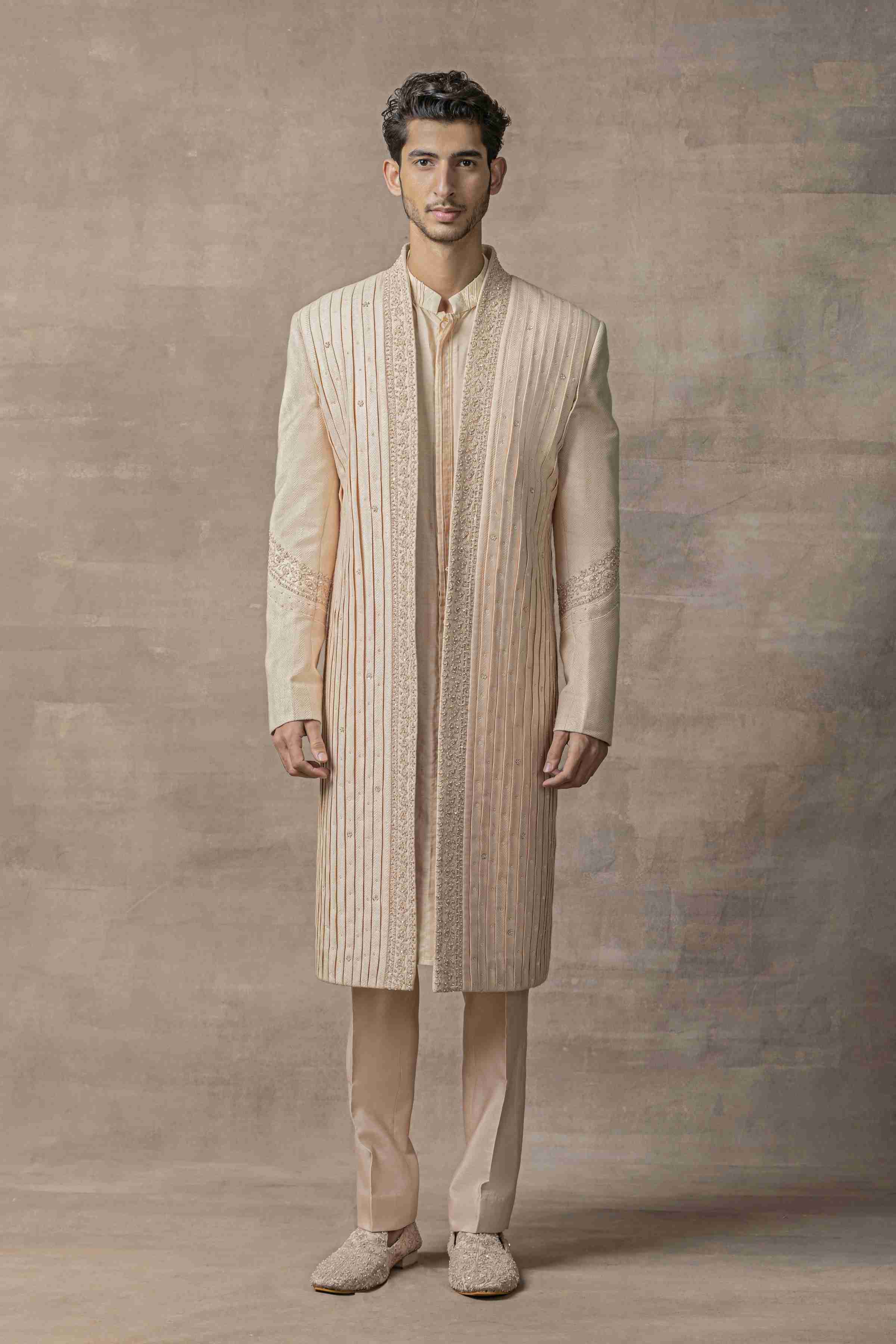 Featuring Rose Old Front Open Pleated Sherwani With Pearl And Sequin Work Paired With Kurta & Pants