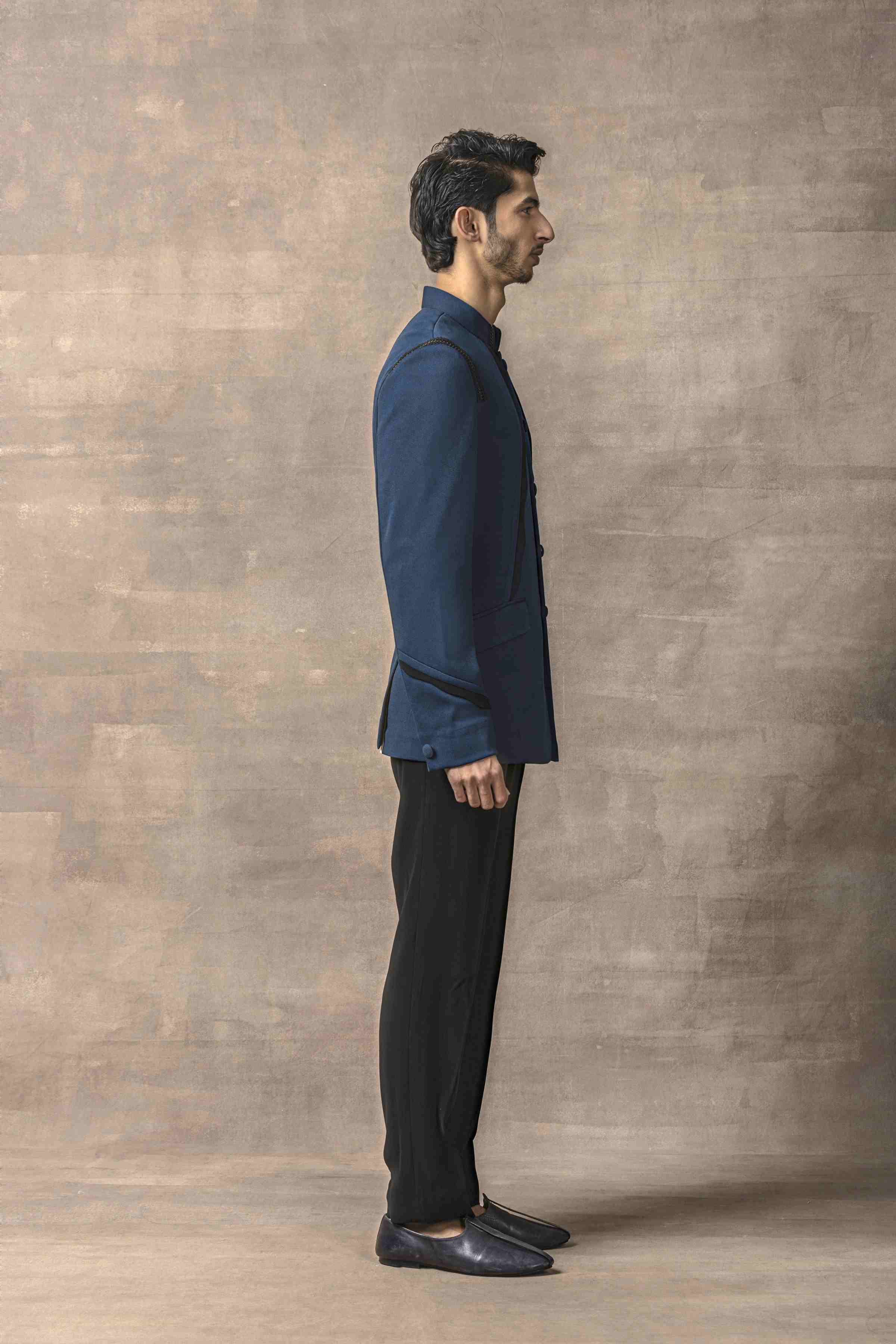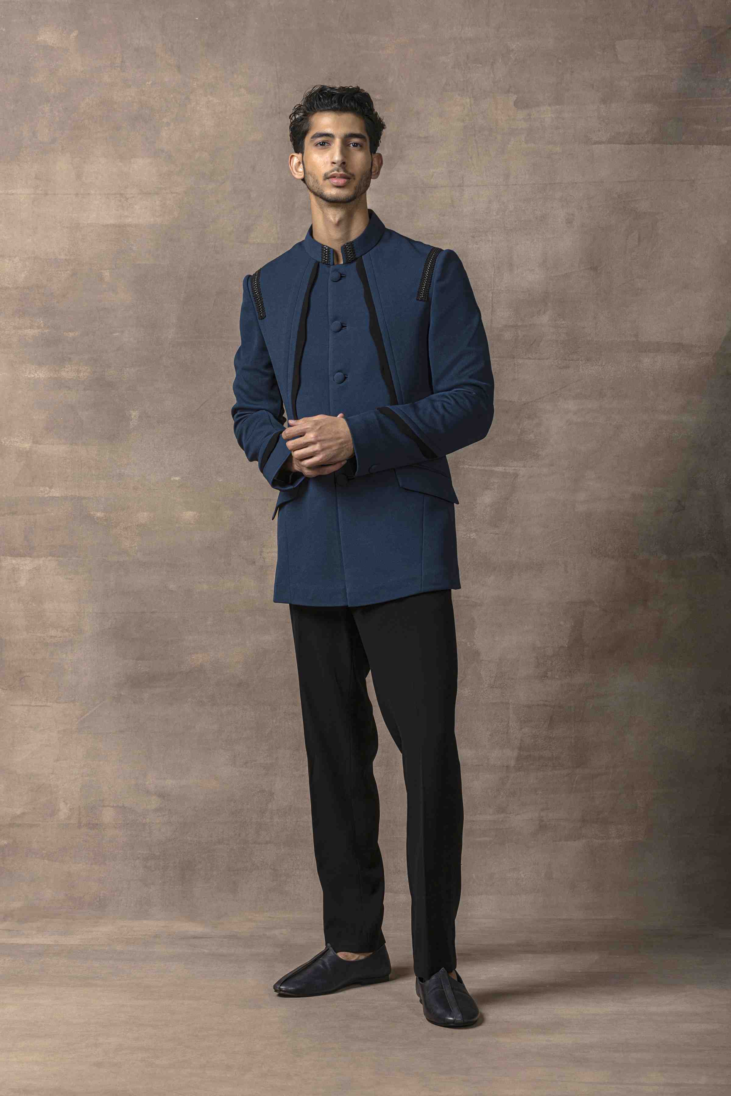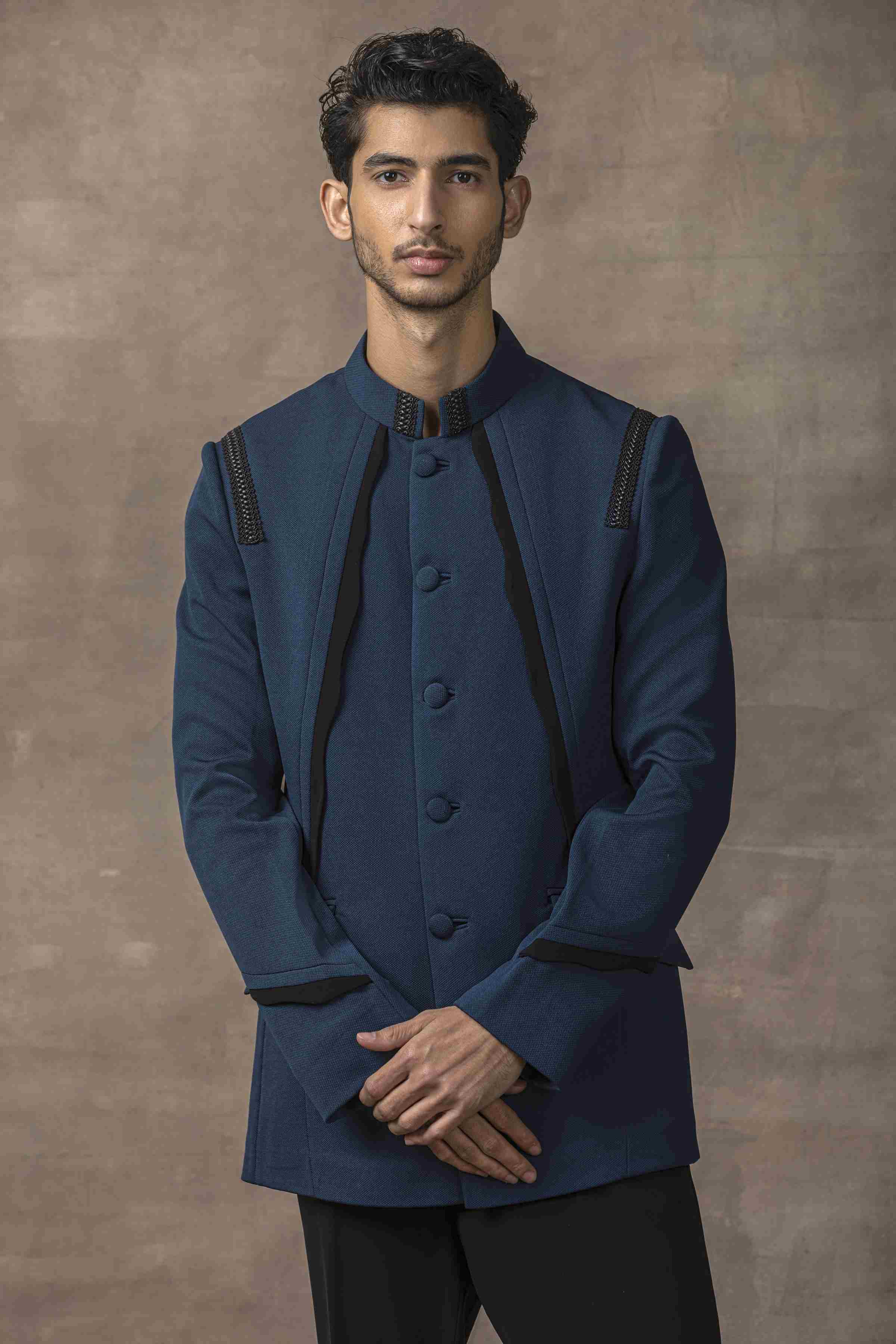 Teal Bandhgala With Black Scalping Set