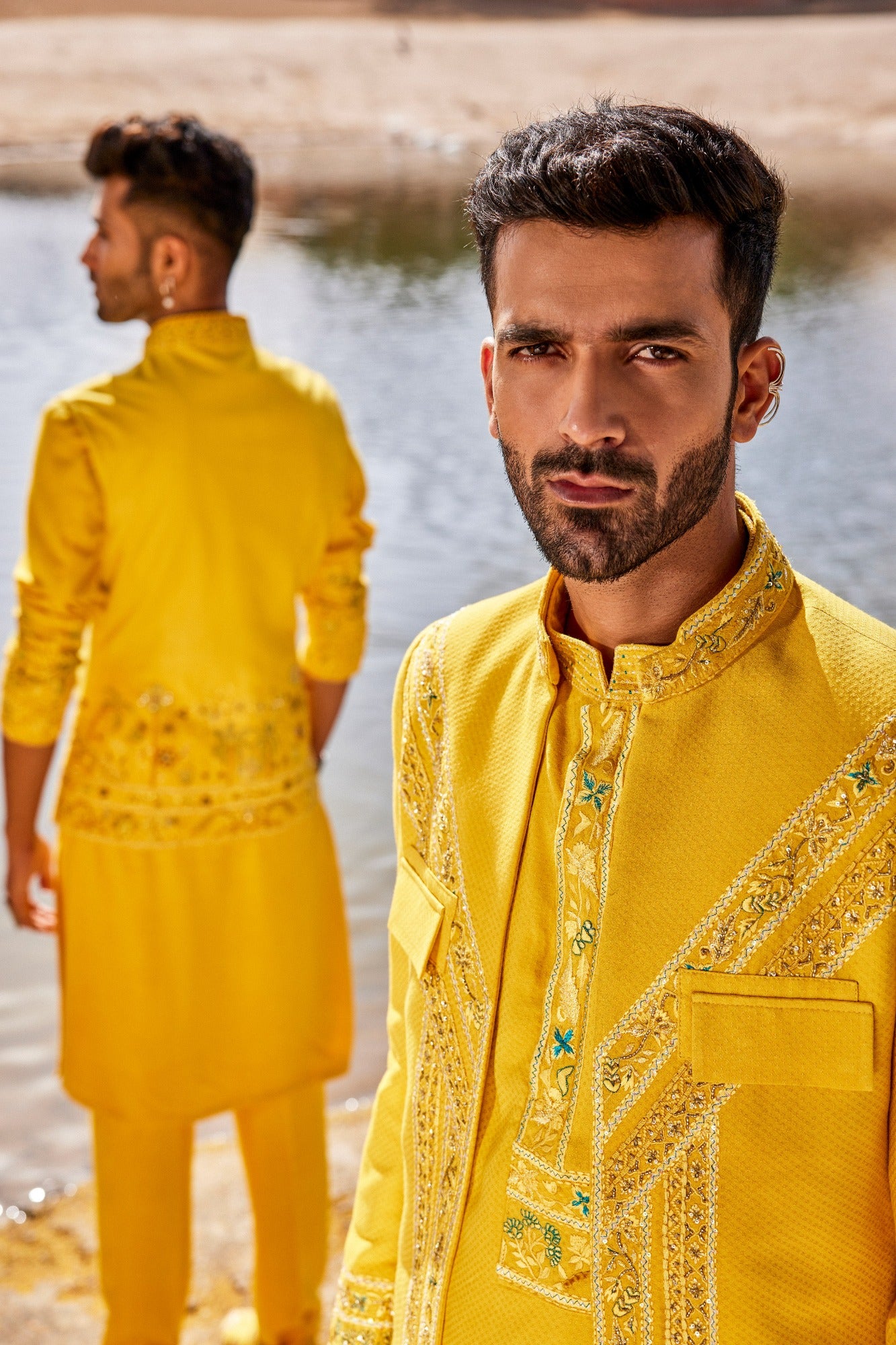 Featuring Yellow Open Bandhgala With Thread Work Detailing Paired With Yellow Kurta And Pants